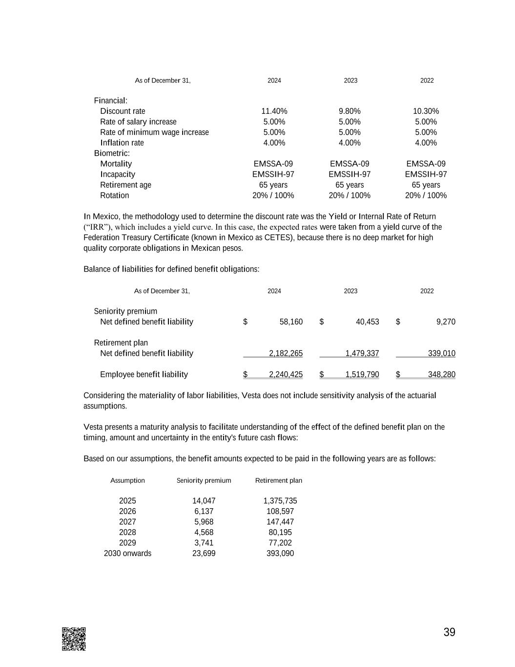 39 As of December 31, 2024 2023 2022 Financial: Discount rate 11.40% 9.80% 10.30% Rate of salary increase 5.00% 5.00% 5.00% Rate of minimum wage increase 5.00% 5.00% 5.00% Inflation rate 4.00% 4.00% 4.00% Biometric: Mortality EMSSA-09 EMSSA-09 EMSSA-09 Incapacity EMSSIH-97 EMSSIH-97 EMSSIH-97 Retirement age 65 years 65 years 65 years Rotation 20% / 100% 20% / 100% 20% / 100% In Mexico, the methodology used to determine the discount rate was the Yield or Internal Rate of Return (“IRR”), which includes a yield curve. In this case, the expected rates were taken from a yield curve of the Federation Treasury Certificate (known in Mexico as CETES), because there is no deep market for high quality corporate obligations in Mexican pesos. Balance of liabilities for defined benefit obligations: As of December 31, 2024 2023 2022 Seniority premium Net defined benefit liability $ 58,160 $ 40,453 $ 9,270 Retirement plan Net defined benefit liability 2,182,265 1,479,337 339,010 Employee benefit liability $ 2,240,425 $ 1,519,790 $ 348,280 Considering the materiality of labor liabilities, Vesta does not include sensitivity analysis of the actuarial assumptions. Vesta presents a maturity analysis to facilitate understanding of the effect of the defined benefit plan on the timing, amount and uncertainty in the entity's future cash flows: Based on our assumptions, the benefit amounts expected to be paid in the following years are as follows: Assumption Seniority premium Retirement plan 2025 14,047 1,375,735 2026 6,137 108,597 2027 5,968 147,447 2028 4,568 80,195 2029 3,741 77,202 2030 onwards 23,699 393,090