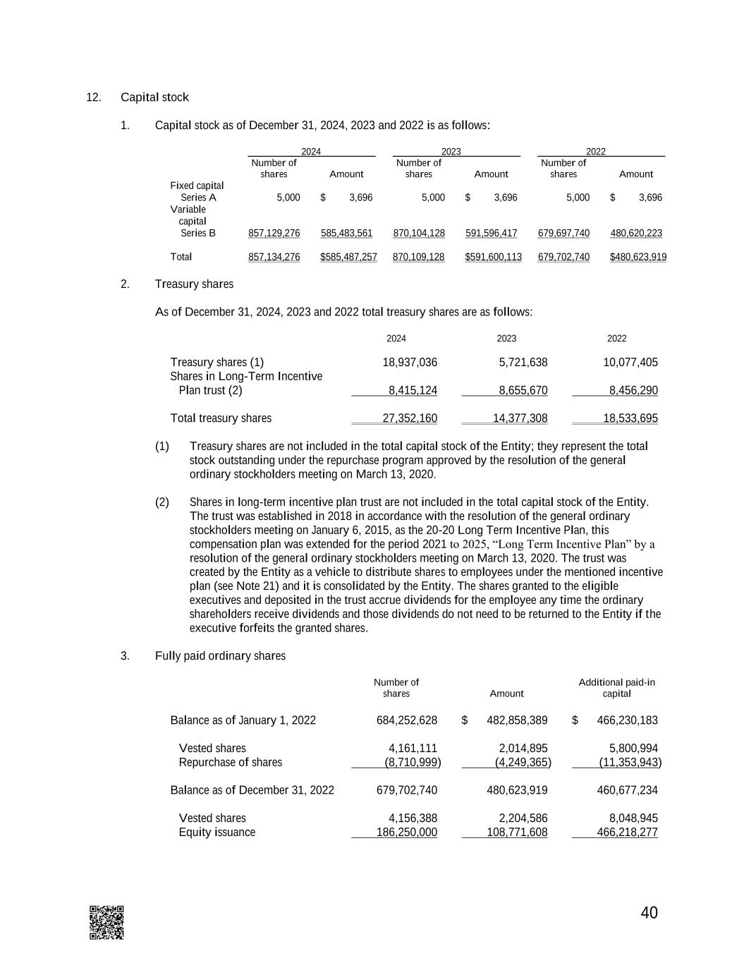 40 12. Capital stock 1. Capital stock as of December 31, 2024, 2023 and 2022 is as follows: 2024 2023 2022 Number of shares Amount Number of shares Amount Number of shares Amount Fixed capital Series A 5,000 $ 3,696 5,000 $ 3,696 5,000 $ 3,696 Variable capital Series B 857,129,276 585,483,561 870,104,128 591,596,417 679,697,740 480,620,223 Total 857,134,276 $585,487,257 870,109,128 $591,600,113 679,702,740 $480,623,919 2. Treasury shares As of December 31, 2024, 2023 and 2022 total treasury shares are as follows: 2024 2023 2022 Treasury shares (1) 18,937,036 5,721,638 10,077,405 Shares in Long-Term Incentive Plan trust (2) 8,415,124 8,655,670 8,456,290 Total treasury shares 27,352,160 14,377,308 18,533,695 (1) Treasury shares are not included in the total capital stock of the Entity; they represent the total stock outstanding under the repurchase program approved by the resolution of the general ordinary stockholders meeting on March 13, 2020. (2) Shares in long-term incentive plan trust are not included in the total capital stock of the Entity. The trust was established in 2018 in accordance with the resolution of the general ordinary stockholders meeting on January 6, 2015, as the 20-20 Long Term Incentive Plan, this compensation plan was extended for the period 2021 to 2025, “Long Term Incentive Plan” by a resolution of the general ordinary stockholders meeting on March 13, 2020. The trust was created by the Entity as a vehicle to distribute shares to employees under the mentioned incentive plan (see Note 21) and it is consolidated by the Entity. The shares granted to the eligible executives and deposited in the trust accrue dividends for the employee any time the ordinary shareholders receive dividends and those dividends do not need to be returned to the Entity if the executive forfeits the granted shares. 3. Fully paid ordinary shares Number of shares Amount Additional paid-in capital Balance as of January 1, 2022 684,252,628 $ 482,858,389 $ 466,230,183 Vested shares 4,161,111 2,014,895 5,800,994 Repurchase of shares (8,710,999) (4,249,365) (11,353,943) Balance as of December 31, 2022 679,702,740 480,623,919 460,677,234 Vested shares 4,156,388 2,204,586 8,048,945 Equity issuance 186,250,000 108,771,608 466,218,277