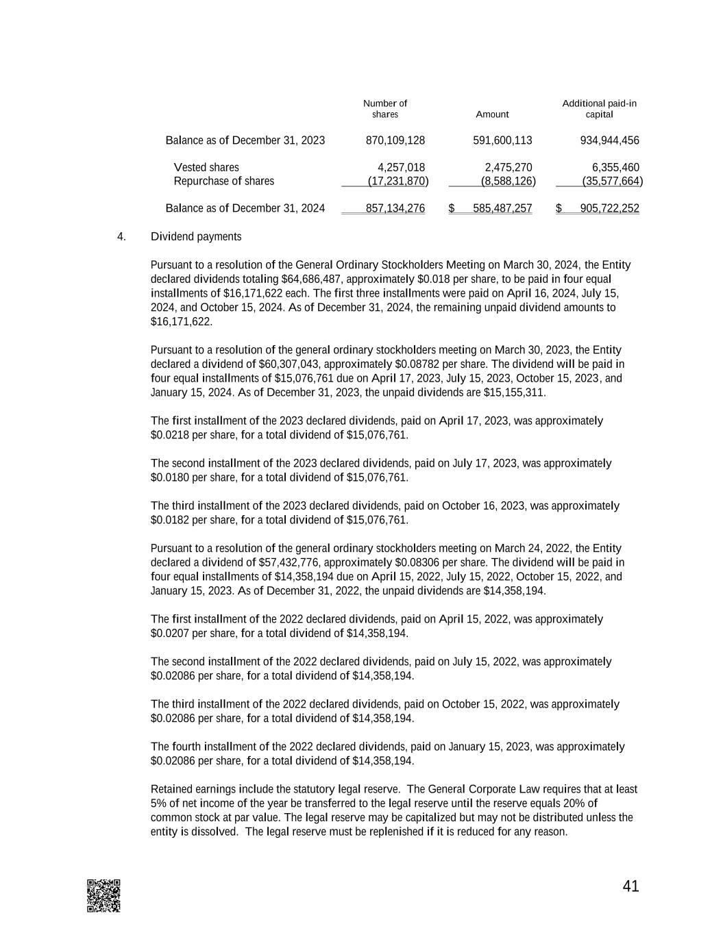 41 Number of shares Amount Additional paid-in capital Balance as of December 31, 2023 870,109,128 591,600,113 934,944,456 Vested shares 4,257,018 2,475,270 6,355,460 Repurchase of shares (17,231,870) (8,588,126) (35,577,664) Balance as of December 31, 2024 857,134,276 $ 585,487,257 $ 905,722,252 4. Dividend payments Pursuant to a resolution of the General Ordinary Stockholders Meeting on March 30, 2024, the Entity declared dividends totaling $64,686,487, approximately $0.018 per share, to be paid in four equal installments of $16,171,622 each. The first three installments were paid on April 16, 2024, July 15, 2024, and October 15, 2024. As of December 31, 2024, the remaining unpaid dividend amounts to $16,171,622. Pursuant to a resolution of the general ordinary stockholders meeting on March 30, 2023, the Entity declared a dividend of $60,307,043, approximately $0.08782 per share. The dividend will be paid in four equal installments of $15,076,761 due on April 17, 2023, July 15, 2023, October 15, 2023, and January 15, 2024. As of December 31, 2023, the unpaid dividends are $15,155,311. The first installment of the 2023 declared dividends, paid on April 17, 2023, was approximately $0.0218 per share, for a total dividend of $15,076,761. The second installment of the 2023 declared dividends, paid on July 17, 2023, was approximately $0.0180 per share, for a total dividend of $15,076,761. The third installment of the 2023 declared dividends, paid on October 16, 2023, was approximately $0.0182 per share, for a total dividend of $15,076,761. Pursuant to a resolution of the general ordinary stockholders meeting on March 24, 2022, the Entity declared a dividend of $57,432,776, approximately $0.08306 per share. The dividend will be paid in four equal installments of $14,358,194 due on April 15, 2022, July 15, 2022, October 15, 2022, and January 15, 2023. As of December 31, 2022, the unpaid dividends are $14,358,194. The first installment of the 2022 declared dividends, paid on April 15, 2022, was approximately $0.0207 per share, for a total dividend of $14,358,194. The second installment of the 2022 declared dividends, paid on July 15, 2022, was approximately $0.02086 per share, for a total dividend of $14,358,194. The third installment of the 2022 declared dividends, paid on October 15, 2022, was approximately $0.02086 per share, for a total dividend of $14,358,194. The fourth installment of the 2022 declared dividends, paid on January 15, 2023, was approximately $0.02086 per share, for a total dividend of $14,358,194. Retained earnings include the statutory legal reserve. The General Corporate Law requires that at least 5% of net income of the year be transferred to the legal reserve until the reserve equals 20% of common stock at par value. The legal reserve may be capitalized but may not be distributed unless the entity is dissolved. The legal reserve must be replenished if it is reduced for any reason.