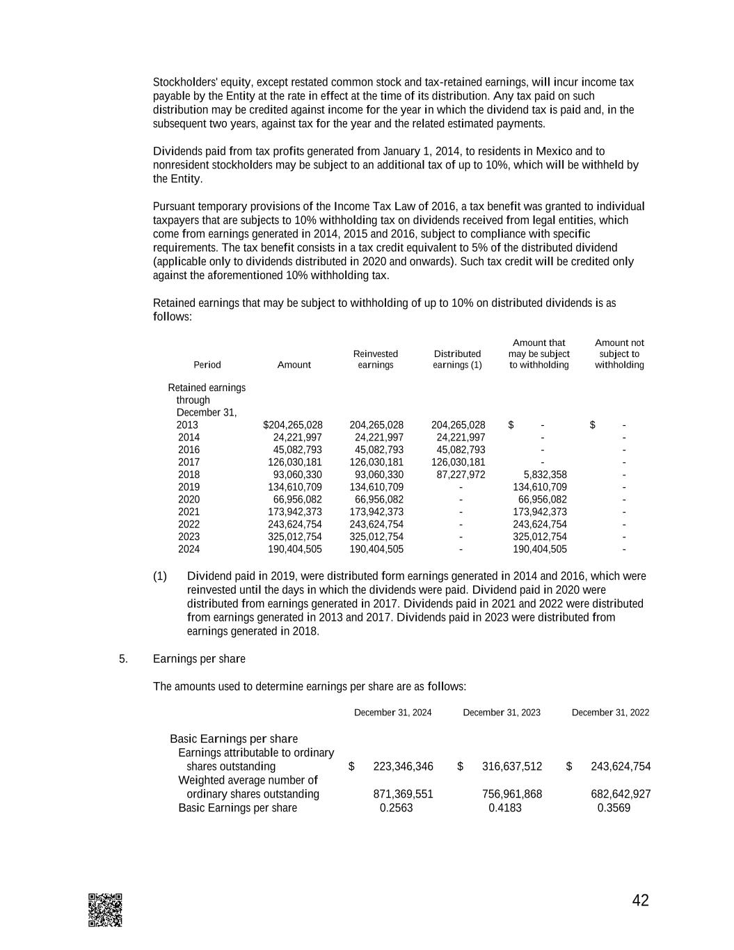 42 Stockholders' equity, except restated common stock and tax-retained earnings, will incur income tax payable by the Entity at the rate in effect at the time of its distribution. Any tax paid on such distribution may be credited against income for the year in which the dividend tax is paid and, in the subsequent two years, against tax for the year and the related estimated payments. Dividends paid from tax profits generated from January 1, 2014, to residents in Mexico and to nonresident stockholders may be subject to an additional tax of up to 10%, which will be withheld by the Entity. Pursuant temporary provisions of the Income Tax Law of 2016, a tax benefit was granted to individual taxpayers that are subjects to 10% withholding tax on dividends received from legal entities, which come from earnings generated in 2014, 2015 and 2016, subject to compliance with specific requirements. The tax benefit consists in a tax credit equivalent to 5% of the distributed dividend (applicable only to dividends distributed in 2020 and onwards). Such tax credit will be credited only against the aforementioned 10% withholding tax. Retained earnings that may be subject to withholding of up to 10% on distributed dividends is as follows: Period Amount Reinvested earnings Distributed earnings (1) Amount that may be subject to withholding Amount not subject to withholding Retained earnings through December 31, 2013 $204,265,028 204,265,028 204,265,028 $ - $ - 2014 24,221,997 24,221,997 24,221,997 - - 2016 45,082,793 45,082,793 45,082,793 - - 2017 126,030,181 126,030,181 126,030,181 - - 2018 93,060,330 93,060,330 87,227,972 5,832,358 - 2019 134,610,709 134,610,709 - 134,610,709 - 2020 66,956,082 66,956,082 - 66,956,082 - 2021 173,942,373 173,942,373 - 173,942,373 - 2022 243,624,754 243,624,754 - 243,624,754 - 2023 325,012,754 325,012,754 - 325,012,754 - 2024 190,404,505 190,404,505 - 190,404,505 - (1) Dividend paid in 2019, were distributed form earnings generated in 2014 and 2016, which were reinvested until the days in which the dividends were paid. Dividend paid in 2020 were distributed from earnings generated in 2017. Dividends paid in 2021 and 2022 were distributed from earnings generated in 2013 and 2017. Dividends paid in 2023 were distributed from earnings generated in 2018. 5. Earnings per share The amounts used to determine earnings per share are as follows: December 31, 2024 December 31, 2023 December 31, 2022 Basic Earnings per share Earnings attributable to ordinary shares outstanding $ 223,346,346 $ 316,637,512 $ 243,624,754 Weighted average number of ordinary shares outstanding 871,369,551 756,961,868 682,642,927 Basic Earnings per share 0.2563 0.4183 0.3569