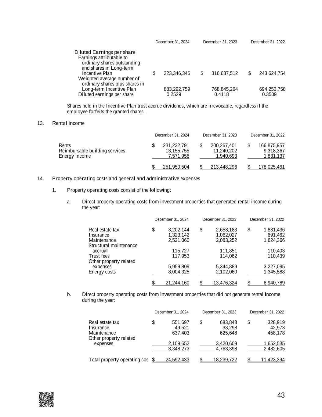 43 December 31, 2024 December 31, 2023 December 31, 2022 Diluted Earnings per share Earnings attributable to ordinary shares outstanding and shares in Long-term Incentive Plan $ 223,346,346 $ 316,637,512 $ 243,624,754 Weighted average number of ordinary shares plus shares in Long-term Incentive Plan 883,292,759 768,845,264 694,253,758 Diluted earnings per share 0.2529 0.4118 0.3509 Shares held in the Incentive Plan trust accrue dividends, which are irrevocable, regardless if the employee forfeits the granted shares. 13. Rental income December 31, 2024 December 31, 2023 December 31, 2022 Rents $ 231,222,791 $ 200,267,401 $ 166,875,957 Reimbursable building services 13,155,755 11,240,202 9,318,367 Energy income 7,571,958 1,940,693 1,831,137 $ 251,950,504 $ 213,448,296 $ 178,025,461 14. Property operating costs and general and administrative expenses 1. Property operating costs consist of the following: a. Direct property operating costs from investment properties that generated rental income during the year: December 31, 2024 December 31, 2023 December 31, 2022 Real estate tax $ 3,202,144 $ 2,658,183 $ 1,831,436 Insurance 1,323,142 1,062,027 691,462 Maintenance 2,521,060 2,083,252 1,624,366 Structural maintenance accrual 115,727 111,851 110,403 Trust fees 117,953 114,062 110,439 Other property related expenses 5,959,809 5,344,889 3,227,095 Energy costs 8,004,325 2,102,060 1,345,588 $ 21,244,160 $ 13,476,324 $ 8,940,789 b. Direct property operating costs from investment properties that did not generate rental income during the year: December 31, 2024 December 31, 2023 December 31, 2022 Real estate tax $ 551,697 $ 683,843 $ 328,919 Insurance 49,521 33,298 42,973 Maintenance 637,403 625,648 458,178 Other property related expenses 2,109,652 3,420,609 1,652,535 3,348,273 4,763,398 2,482,605 Total property operating costs $ 24,592,433 $ 18,239,722 $ 11,423,394