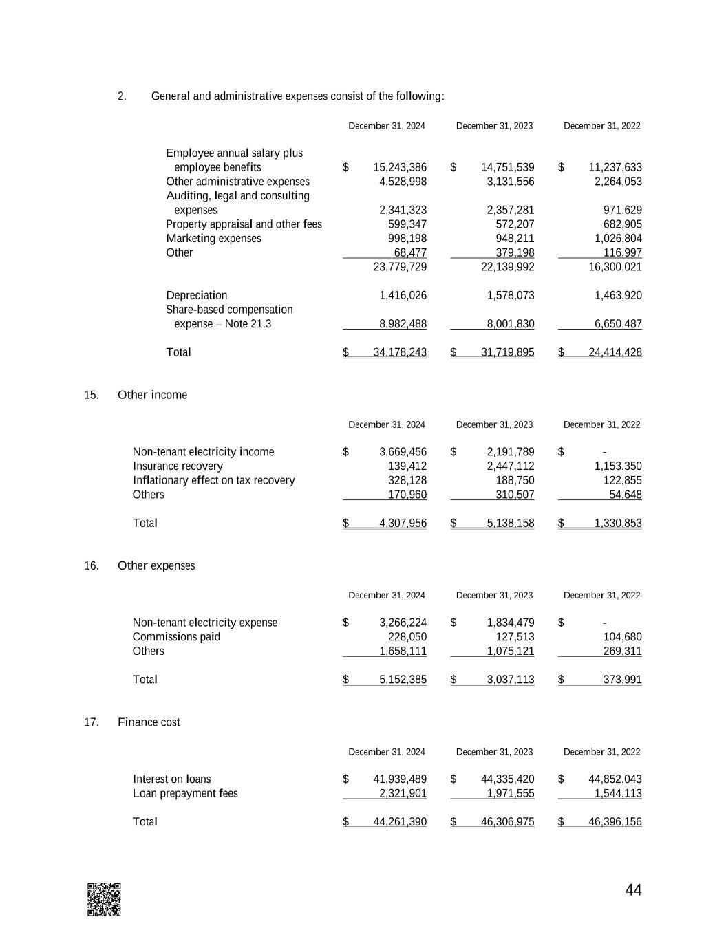44 2. General and administrative expenses consist of the following: December 31, 2024 December 31, 2023 December 31, 2022 Employee annual salary plus employee benefits $ 15,243,386 $ 14,751,539 $ 11,237,633 Other administrative expenses 4,528,998 3,131,556 2,264,053 Auditing, legal and consulting expenses 2,341,323 2,357,281 971,629 Property appraisal and other fees 599,347 572,207 682,905 Marketing expenses 998,198 948,211 1,026,804 Other 68,477 379,198 116,997 23,779,729 22,139,992 16,300,021 Depreciation 1,416,026 1,578,073 1,463,920 Share-based compensation expense – Note 21.3 8,982,488 8,001,830 6,650,487 Total $ 34,178,243 $ 31,719,895 $ 24,414,428 15. Other income December 31, 2024 December 31, 2023 December 31, 2022 Non-tenant electricity income $ 3,669,456 $ 2,191,789 $ - Insurance recovery 139,412 2,447,112 1,153,350 Inflationary effect on tax recovery 328,128 188,750 122,855 Others 170,960 310,507 54,648 Total $ 4,307,956 $ 5,138,158 $ 1,330,853 16. Other expenses December 31, 2024 December 31, 2023 December 31, 2022 Non-tenant electricity expense $ 3,266,224 $ 1,834,479 $ - Commissions paid 228,050 127,513 104,680 Others 1,658,111 1,075,121 269,311 Total $ 5,152,385 $ 3,037,113 $ 373,991 17. Finance cost December 31, 2024 December 31, 2023 December 31, 2022 Interest on loans $ 41,939,489 $ 44,335,420 $ 44,852,043 Loan prepayment fees 2,321,901 1,971,555 1,544,113 Total $ 44,261,390 $ 46,306,975 $ 46,396,156