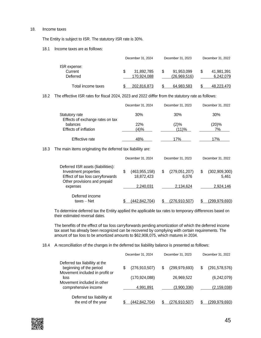 45 18. Income taxes The Entity is subject to ISR. The statutory ISR rate is 30%. 18.1 Income taxes are as follows: December 31, 2024 December 31, 2023 December 31, 2022 ISR expense: Current $ 31,892,785 $ 91,953,099 $ 41,981,391 Deferred 170,924,088 (26,969,516) 6,242,079 Total income taxes $ 202,816,873 $ 64,983,583 $ 48,223,470 18.2 The effective ISR rates for fiscal 2024, 2023 and 2022 differ from the statutory rate as follows: December 31, 2024 December 31, 2023 December 31, 2022 Statutory rate 30% 30% 30% Effects of exchange rates on tax balances 22% (2)% (20)% Effects of inflation (4)% (11)% 7% Effective rate 48% 17% 17% 18.3 The main items originating the deferred tax liability are: December 31, 2024 December 31, 2023 December 31, 2022 Deferred ISR assets (liabilities): Investment properties $ (463,955,158) $ (279,051,207) $ (302,909,300) Effect of tax loss carryforwards 18,872,423 6,076 5,461 Other provisions and prepaid expenses 2,240,031 2,134,624 2,924,146 Deferred income taxes – Net $ (442,842,704) $ (276,910,507) $ (299,979,693) To determine deferred tax the Entity applied the applicable tax rates to temporary differences based on their estimated reversal dates. The benefits of the effect of tax loss carryforwards pending amortization of which the deferred income tax asset has already been recognized can be recovered by complying with certain requirements. The amount of tax loss to be amortized amounts to $62,908,075, which matures in 2034. 18.4 A reconciliation of the changes in the deferred tax liability balance is presented as follows: December 31, 2024 December 31, 2023 December 31, 2022 Deferred tax liability at the beginning of the period $ (276,910,507) $ (299,979,693) $ (291,578,576) Movement included in profit or loss (170,924,088) 26,969,522 (6,242,079) Movement included in other comprehensive income 4,991,891 (3,900,336) (2,159,038) Deferred tax liability at the end of the year $ (442,842,704) $ (276,910,507) $ (299,979,693)