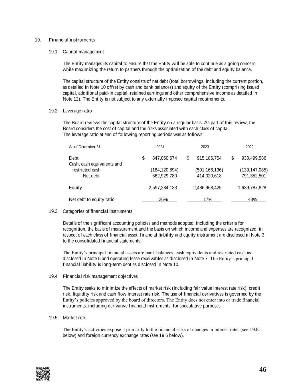 46 19. Financial instruments 19.1 Capital management The Entity manages its capital to ensure that the Entity will be able to continue as a going concern while maximizing the return to partners through the optimization of the debt and equity balance. The capital structure of the Entity consists of net debt (total borrowings, including the current portion, as detailed in Note 10 offset by cash and bank balances) and equity of the Entity (comprising issued capital, additional paid-in capital, retained earnings and other comprehensive income as detailed in Note 12). The Entity is not subject to any externally imposed capital requirements. 19.2 Leverage ratio The Board reviews the capital structure of the Entity on a regular basis. As part of this review, the Board considers the cost of capital and the risks associated with each class of capital. The leverage ratio at end of following reporting periods was as follows: As of December 31, 2024 2023 2022 Debt $ 847,050,674 $ 915,186,754 $ 930,499,586 Cash, cash equivalents and restricted cash (184,120,894) (501,166,136) (139,147,085) Net debt 662,929,780 414,020,618 791,352,501 Equity 2,597,284,183 2,486,968,425 1,639,787,828 Net debt to equity ratio 26% 17% 48% 19.3 Categories of financial instruments Details of the significant accounting policies and methods adopted, including the criteria for recognition, the basis of measurement and the basis on which income and expenses are recognized, in respect of each class of financial asset, financial liability and equity instrument are disclosed in Note 3 to the consolidated financial statements. The Entity’s principal financial assets are bank balances, cash equivalents and restricted cash as disclosed in Note 5 and operating lease receivables as disclosed in Note 7. The Entity’s principal financial liability is long-term debt as disclosed in Note 10. 19.4 Financial risk management objectives The Entity seeks to minimize the effects of market risk (including fair value interest rate risk), credit risk, liquidity risk and cash flow interest rate risk. The use of financial derivatives is governed by the Entity’s policies approved by the board of directors. The Entity does not enter into or trade financial instruments, including derivative financial instruments, for speculative purposes. 19.5 Market risk The Entity’s activities expose it primarily to the financial risks of changes in interest rates (see 19.8 below) and foreign currency exchange rates (see 19.6 below).