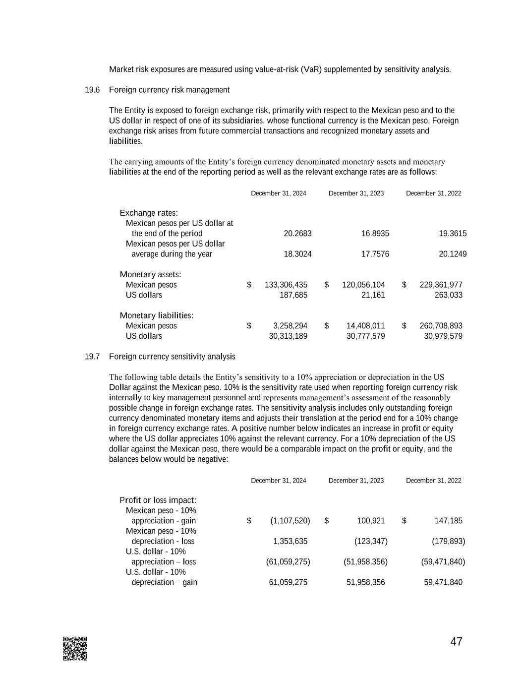 47 Market risk exposures are measured using value-at-risk (VaR) supplemented by sensitivity analysis. 19.6 Foreign currency risk management The Entity is exposed to foreign exchange risk, primarily with respect to the Mexican peso and to the US dollar in respect of one of its subsidiaries, whose functional currency is the Mexican peso. Foreign exchange risk arises from future commercial transactions and recognized monetary assets and liabilities. The carrying amounts of the Entity’s foreign currency denominated monetary assets and monetary liabilities at the end of the reporting period as well as the relevant exchange rates are as follows: December 31, 2024 December 31, 2023 December 31, 2022 Exchange rates: Mexican pesos per US dollar at the end of the period 20.2683 16.8935 19.3615 Mexican pesos per US dollar average during the year 18.3024 17.7576 20.1249 Monetary assets: Mexican pesos $ 133,306,435 $ 120,056,104 $ 229,361,977 US dollars 187,685 21,161 263,033 Monetary liabilities: Mexican pesos $ 3,258,294 $ 14,408,011 $ 260,708,893 US dollars 30,313,189 30,777,579 30,979,579 19.7 Foreign currency sensitivity analysis The following table details the Entity’s sensitivity to a 10% appreciation or depreciation in the US Dollar against the Mexican peso. 10% is the sensitivity rate used when reporting foreign currency risk internally to key management personnel and represents management’s assessment of the reasonably possible change in foreign exchange rates. The sensitivity analysis includes only outstanding foreign currency denominated monetary items and adjusts their translation at the period end for a 10% change in foreign currency exchange rates. A positive number below indicates an increase in profit or equity where the US dollar appreciates 10% against the relevant currency. For a 10% depreciation of the US dollar against the Mexican peso, there would be a comparable impact on the profit or equity, and the balances below would be negative: December 31, 2024 December 31, 2023 December 31, 2022 Profit or loss impact: Mexican peso - 10% appreciation - gain $ (1,107,520) $ 100,921 $ 147,185 Mexican peso - 10% depreciation - loss 1,353,635 (123,347) (179,893) U.S. dollar - 10% appreciation – loss (61,059,275) (51,958,356) (59,471,840) U.S. dollar - 10% depreciation – gain 61,059,275 51,958,356 59,471,840
