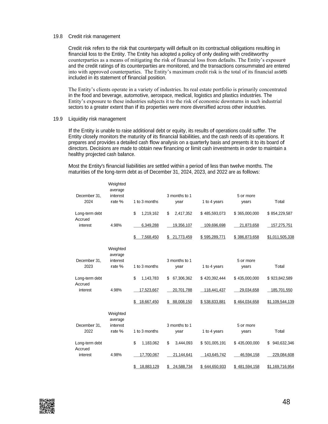 48 19.8 Credit risk management Credit risk refers to the risk that counterparty will default on its contractual obligations resulting in financial loss to the Entity. The Entity has adopted a policy of only dealing with creditworthy counterparties as a means of mitigating the risk of financial loss from defaults. The Entity’s exposure and the credit ratings of its counterparties are monitored, and the transactions consummated are entered into with approved counterparties. The Entity’s maximum credit risk is the total of its financial assets included in its statement of financial position. The Entity’s clients operate in a variety of industries. Its real estate portfolio is primarily concentrated in the food and beverage, automotive, aerospace, medical, logistics and plastics industries. The Entity’s exposure to these industries subjects it to the risk of economic downturns in such industrial sectors to a greater extent than if its properties were more diversified across other industries. 19.9 Liquidity risk management If the Entity is unable to raise additional debt or equity, its results of operations could suffer. The Entity closely monitors the maturity of its financial liabilities, and the cash needs of its operations. It prepares and provides a detailed cash flow analysis on a quarterly basis and presents it to its board of directors. Decisions are made to obtain new financing or limit cash investments in order to maintain a healthy projected cash balance. Most the Entity's financial liabilities are settled within a period of less than twelve months. The maturities of the long-term debt as of December 31, 2024, 2023, and 2022 are as follows: December 31, 2024 Weighted average interest rate % 1 to 3 months 3 months to 1 year 1 to 4 years 5 or more years Total Long-term debt $ 1,219,162 $ 2,417,352 $ 485,593,073 $ 365,000,000 $ 854,229,587 Accrued interest 4.98% 6,349,288 19,356,107 109,696,698 21,873,658 157,275,751 $ 7,568,450 $ 21,773,459 $ 595,289,771 $ 386,873,658 $1,011,505,338 December 31, 2023 Weighted average interest rate % 1 to 3 months 3 months to 1 year 1 to 4 years 5 or more years Total Long-term debt $ 1,143,783 $ 67,306,362 $ 420,392,444 $ 435,000,000 $ 923,842,589 Accrued interest 4.98% 17,523,667 20,701,788 118,441,437 29,034,658 185,701,550 $ 18,667,450 $ 88,008,150 $ 538,833,881 $ 464,034,658 $1,109,544,139 December 31, 2022 Weighted average interest rate % 1 to 3 months 3 months to 1 year 1 to 4 years 5 or more years Total Long-term debt $ 1,183,062 $ 3,444,093 $ 501,005,191 $ 435,000,000 $ 940,632,346 Accrued interest 4.98% 17,700,067 21,144,641 143,645,742 46,594,158 229,084,608 $ 18,883,129 $ 24,588,734 $ 644,650,933 $ 481,594,158 $1,169,716,954