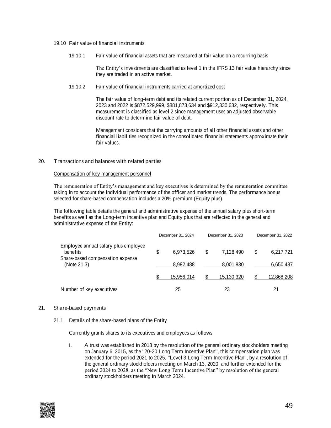 49 19.10 Fair value of financial instruments 19.10.1 Fair value of financial assets that are measured at fair value on a recurring basis The Entity’s investments are classified as level 1 in the IFRS 13 fair value hierarchy since they are traded in an active market. 19.10.2 Fair value of financial instruments carried at amortized cost The fair value of long-term debt and its related current portion as of December 31, 2024, 2023 and 2022 is $872,529,999, $881,873,634 and $912,330,632, respectively. This measurement is classified as level 2 since management uses an adjusted observable discount rate to determine fair value of debt. Management considers that the carrying amounts of all other financial assets and other financial liabilities recognized in the consolidated financial statements approximate their fair values. 20. Transactions and balances with related parties Compensation of key management personnel The remuneration of Entity’s management and key executives is determined by the remuneration committee taking in to account the individual performance of the officer and market trends. The performance bonus selected for share-based compensation includes a 20% premium (Equity plus). The following table details the general and administrative expense of the annual salary plus short-term benefits as well as the Long-term incentive plan and Equity plus that are reflected in the general and administrative expense of the Entity: December 31, 2024 December 31, 2023 December 31, 2022 Employee annual salary plus employee benefits $ 6,973,526 $ 7,128,490 $ 6,217,721 Share-based compensation expense (Note 21.3) 8,982,488 8,001,830 6,650,487 $ 15,956,014 $ 15,130,320 $ 12,868,208 Number of key executives 25 23 21 21. Share-based payments 21.1 Details of the share-based plans of the Entity Currently grants shares to its executives and employees as follows: i. A trust was established in 2018 by the resolution of the general ordinary stockholders meeting on January 6, 2015, as the "20-20 Long Term Incentive Plan", this compensation plan was extended for the period 2021 to 2025, "Level 3 Long Term Incentive Plan", by a resolution of the general ordinary stockholders meeting on March 13, 2020; and further extended for the period 2024 to 2028, as the “New Long Term Incentive Plan” by resolution of the general ordinary stockholders meeting in March 2024.