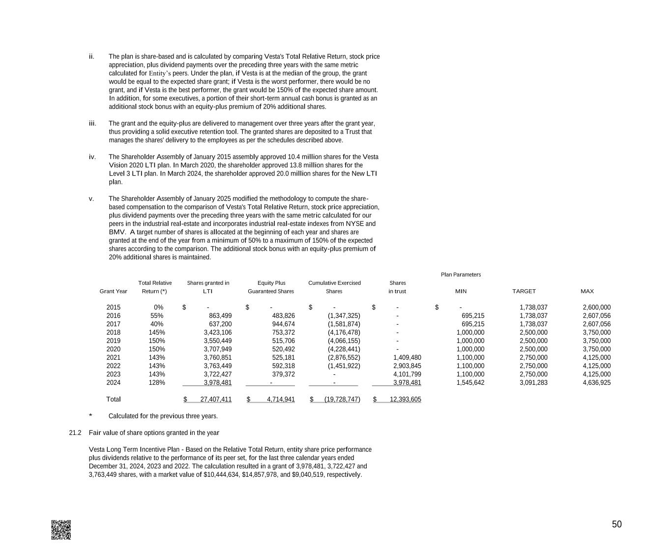 50 ii. The plan is share-based and is calculated by comparing Vesta's Total Relative Return, stock price appreciation, plus dividend payments over the preceding three years with the same metric calculated for Entity’s peers. Under the plan, if Vesta is at the median of the group, the grant would be equal to the expected share grant; if Vesta is the worst performer, there would be no grant, and if Vesta is the best performer, the grant would be 150% of the expected share amount. In addition, for some executives, a portion of their short-term annual cash bonus is granted as an additional stock bonus with an equity-plus premium of 20% additional shares. iii. The grant and the equity-plus are delivered to management over three years after the grant year, thus providing a solid executive retention tool. The granted shares are deposited to a Trust that manages the shares' delivery to the employees as per the schedules described above. iv. The Shareholder Assembly of January 2015 assembly approved 10.4 million shares for the Vesta Vision 2020 LTI plan. In March 2020, the shareholder approved 13.8 million shares for the Level 3 LTI plan. In March 2024, the shareholder approved 20.0 million shares for the New LTI plan. v. The Shareholder Assembly of January 2025 modified the methodology to compute the share- based compensation to the comparison of Vesta's Total Relative Return, stock price appreciation, plus dividend payments over the preceding three years with the same metric calculated for our peers in the industrial real-estate and incorporates industrial real-estate indexes from NYSE and BMV. A target number of shares is allocated at the beginning of each year and shares are granted at the end of the year from a minimum of 50% to a maximum of 150% of the expected shares according to the comparison. The additional stock bonus with an equity-plus premium of 20% additional shares is maintained. Plan Parameters Grant Year Total Relative Return (*) Shares granted in LTI Equity Plus Guaranteed Shares Cumulative Exercised Shares Shares in trust MIN TARGET MAX 2015 0% $ - $ - $ - $ - $ - 1,738,037 2,600,000 2016 55% 863,499 483,826 (1,347,325) - 695,215 1,738,037 2,607,056 2017 40% 637,200 944,674 (1,581,874) - 695,215 1,738,037 2,607,056 2018 145% 3,423,106 753,372 (4,176,478) - 1,000,000 2,500,000 3,750,000 2019 150% 3,550,449 515,706 (4,066,155) - 1,000,000 2,500,000 3,750,000 2020 150% 3,707,949 520,492 (4,228,441) - 1,000,000 2,500,000 3,750,000 2021 143% 3,760,851 525,181 (2,876,552) 1,409,480 1,100,000 2,750,000 4,125,000 2022 143% 3,763,449 592,318 (1,451,922) 2,903,845 1,100,000 2,750,000 4,125,000 2023 143% 3,722,427 379,372 - 4,101,799 1,100,000 2,750,000 4,125,000 2024 128% 3,978,481 - - 3,978,481 1,545,642 3,091,283 4,636,925 Total $ 27,407,411 $ 4,714,941 $ (19,728,747) $ 12,393,605 * Calculated for the previous three years. 21.2 Fair value of share options granted in the year Vesta Long Term Incentive Plan - Based on the Relative Total Return, entity share price performance plus dividends relative to the performance of its peer set, for the last three calendar years ended December 31, 2024, 2023 and 2022. The calculation resulted in a grant of 3,978,481, 3,722,427 and 3,763,449 shares, with a market value of $10,444,634, $14,857,978, and $9,040,519, respectively.