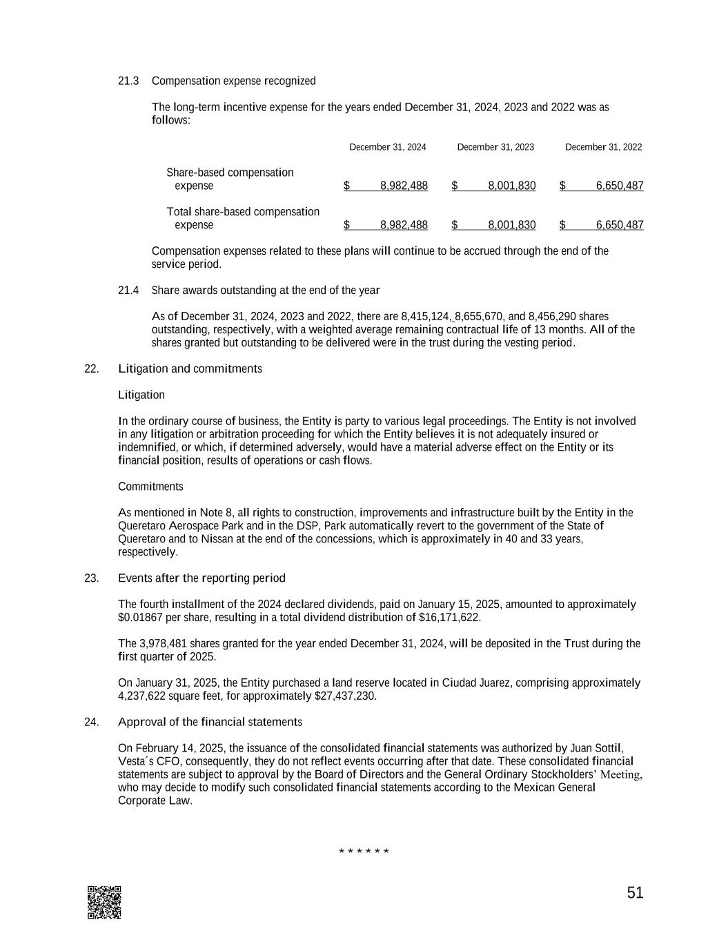 51 21.3 Compensation expense recognized The long-term incentive expense for the years ended December 31, 2024, 2023 and 2022 was as follows: December 31, 2024 December 31, 2023 December 31, 2022 Share-based compensation expense $ 8,982,488 $ 8,001,830 $ 6,650,487 Total share-based compensation expense $ 8,982,488 $ 8,001,830 $ 6,650,487 Compensation expenses related to these plans will continue to be accrued through the end of the service period. 21.4 Share awards outstanding at the end of the year As of December 31, 2024, 2023 and 2022, there are 8,415,124, 8,655,670, and 8,456,290 shares outstanding, respectively, with a weighted average remaining contractual life of 13 months. All of the shares granted but outstanding to be delivered were in the trust during the vesting period. 22. Litigation and commitments Litigation In the ordinary course of business, the Entity is party to various legal proceedings. The Entity is not involved in any litigation or arbitration proceeding for which the Entity believes it is not adequately insured or indemnified, or which, if determined adversely, would have a material adverse effect on the Entity or its financial position, results of operations or cash flows. Commitments As mentioned in Note 8, all rights to construction, improvements and infrastructure built by the Entity in the Queretaro Aerospace Park and in the DSP, Park automatically revert to the government of the State of Queretaro and to Nissan at the end of the concessions, which is approximately in 40 and 33 years, respectively. 23. Events after the reporting period The fourth installment of the 2024 declared dividends, paid on January 15, 2025, amounted to approximately $0.01867 per share, resulting in a total dividend distribution of $16,171,622. The 3,978,481 shares granted for the year ended December 31, 2024, will be deposited in the Trust during the first quarter of 2025. On January 31, 2025, the Entity purchased a land reserve located in Ciudad Juarez, comprising approximately 4,237,622 square feet, for approximately $27,437,230. 24. Approval of the financial statements On February 14, 2025, the issuance of the consolidated financial statements was authorized by Juan Sottil, Vesta´s CFO, consequently, they do not reflect events occurring after that date. These consolidated financial statements are subject to approval by the Board of Directors and the General Ordinary Stockholders’ Meeting, who may decide to modify such consolidated financial statements according to the Mexican General Corporate Law. * * * * * *