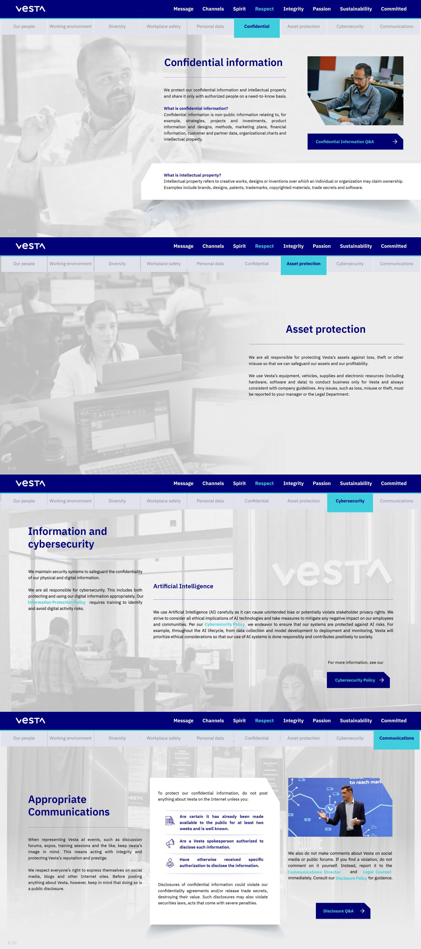 P.13 Respect Working environment Speak Up Vesta Our Working Environment Q&A Human Rights Policy Human Rights Risks and Action Strategies UN Global Compact. UN Guiding Principles on Business and Human Rights Message Spirit Integrity PassionChannels Sustainability Committed Diversity Workplace safety Personal dataOur people Confidential Asset protection Cybersecurity Communications P.14 Respect Diversity Diversity, Equality and Inclusion PolicyTarget Gender Equality Program He for She Disclosure Policy communication channels Message Spirit Integrity PassionChannels Sustainability Committed Working environment Workplace safety Personal dataOur people Confidential Asset protection Cybersecurity Communications P.15 Respect Workplace safety Workplace Safety Q&A Message Spirit Integrity PassionChannels Sustainability Committed Working environment Diversity Personal dataOur people Confidential Asset protection Cybersecurity Communications P.16 Respect Personal data Message Spirit Integrity PassionChannels Sustainability Committed Working environment Diversity Workplace safetyOur people Confidential Asset protection Cybersecurity Communications