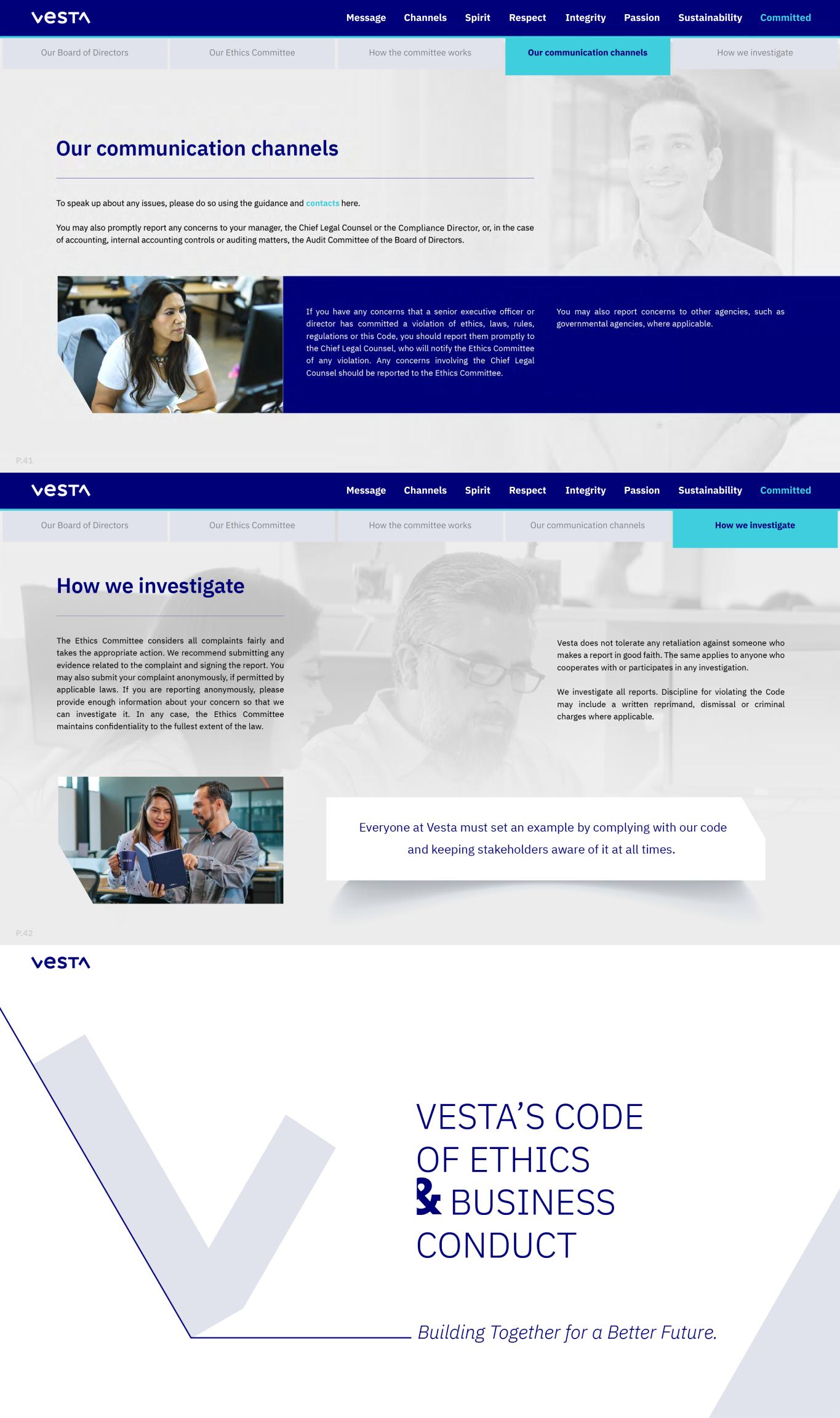 P.09 How do we practice our values? SpiritMessage Respect Integrity PassionChannels Sustainability Committed What is our purpose? What is our guiding principle? What are our values?Who are we? Vesta’s ten commitments P.10 Vesta’s ten commitments Spirit https://vesta.com.mx/en/asg-10-compromisos Message Respect Integrity PassionChannels Sustainability Committed What is our purpose? What is our guiding principle? What are our values? How do we practice our values?Who are we? P.11 Respect Working environment Diversity Workplace safety Personal dataOur people Confidential Asset protection Cybersecurity Communications Message Spirit Integrity PassionChannels Sustainability Committed P.12 Respect Our people Our People Q&A Message Spirit Integrity PassionChannels Sustainability Committed Working environment Diversity Workplace safety Personal data Confidential Asset protection Cybersecurity Communications