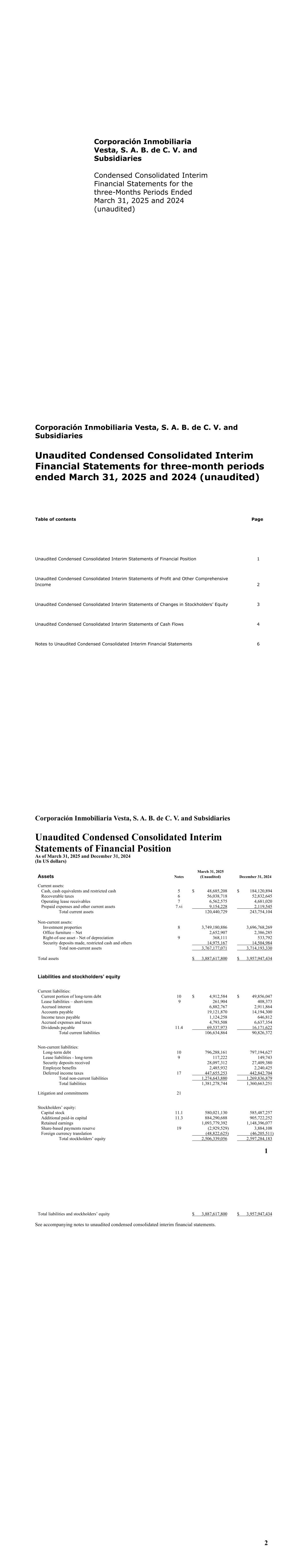 Vesta is a real estate owner, developer and asset manager of industrial buildings and distribution centers in Mexico. As of March 31, 2025, Vesta owned 228 properties located in modern industrial parks in 16 states of Mexico totaling a GLA of 41.2 million sf (3.7 million m2). Vesta has several world-class clients participating in a variety of industries such as automotive, aerospace, retail, high-tech, pharmaceuticals, electronics, food and beverage and packaging. For additional information visit: www.vesta.com.mx.