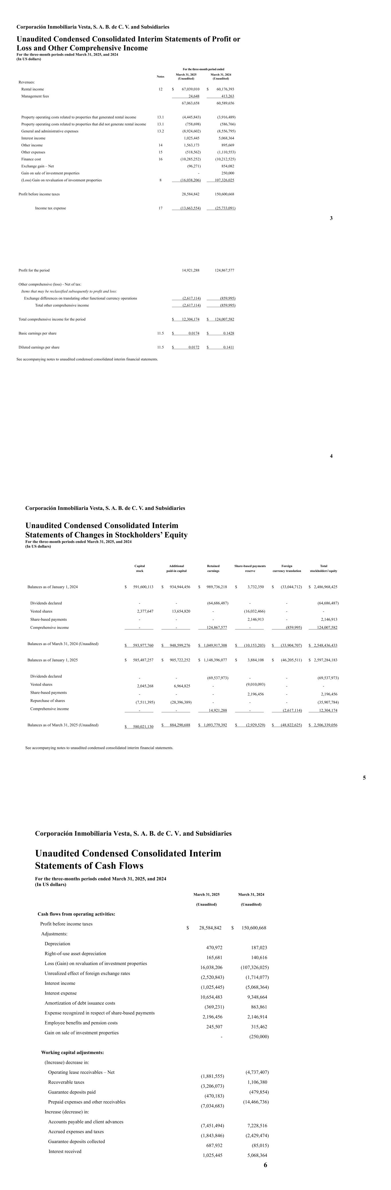 Mexico City, April 23, 2025 – Corporación Inmobiliaria Vesta S.A.B. de C.V., (“Vesta”, or the “Company”) (BMV: VESTA; NYSE: VTMX), a leading industrial real estate company in Mexico, today announced results for the first quarter ended March 31, 2025. All figures included herein were prepared in accordance with International Financial Reporting Standards (IFRS), which differs in certain significant respects from U.S. GAAP. This information should be read in conjunction with, and is qualified in its entirety by reference to, our consolidated financial statements, including the notes thereto. Vesta’s financial results are stated in US dollars unless otherwise noted.