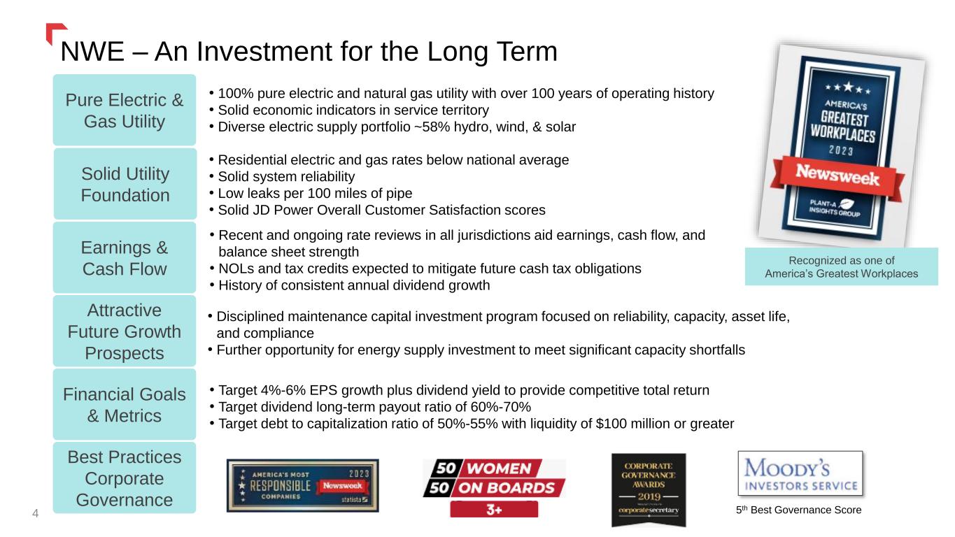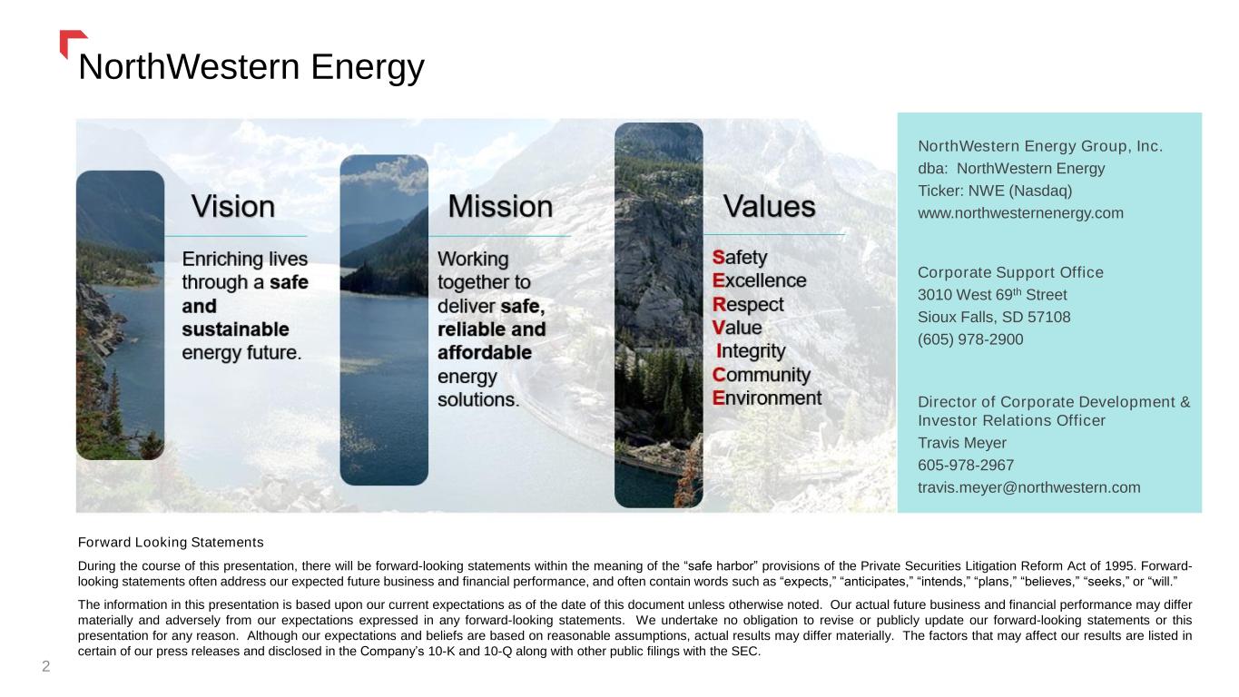 NorthWestern Energy 2 Forward Looking Statements During the course of this presentation, there will be forward-looking statements within the meaning of the “safe harbor” provisions of the Private Securities Litigation Reform Act of 1995. Forward- looking statements often address our expected future business and financial performance, and often contain words such as “expects,” “anticipates,” “intends,” “plans,” “believes,” “seeks,” or “will.” The information in this presentation is based upon our current expectations as of the date of this document unless otherwise noted. Our actual future business and financial performance may differ materially and adversely from our expectations expressed in any forward-looking statements. We undertake no obligation to revise or publicly update our forward-looking statements or this presentation for any reason. Although our expectations and beliefs are based on reasonable assumptions, actual results may differ materially. The factors that may affect our results are listed in certain of our press releases and disclosed in the Company’s 10-K and 10-Q along with other public filings with the SEC. NorthWestern Energy Group, Inc. dba: NorthWestern Energy Ticker: NWE (Nasdaq) www.northwesternenergy.com Corporate Support Office 3010 West 69th Street Sioux Falls, SD 57108 (605) 978-2900 Director of Corporate Development & Investor Relations Officer Travis Meyer 605-978-2967 travis.meyer@northwestern.com