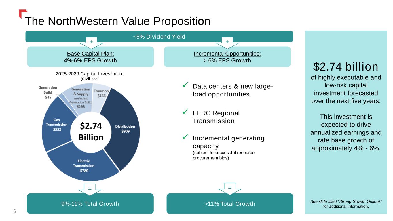 About NorthWestern 5 Montana Operations Electric 413,400 customers 25,390 miles – transmission & distribution lines 1,065 MW maximum capacity owned power generation Natural Gas 214,500 customers 7,354 miles of transmission and distribution pipeline 17.85 Bcf of gas storage capacity Own 28.2 Bcf of proven natural gas reserves Nebraska Operations Natural Gas 43,300 customers 830 miles of distribution pipeline Data as of 12/31/2024 South Dakota Operations Electric 65,300 customers 3,735 miles – transmission & distribution lines 420 MW nameplate owned power generation Natural Gas 50,500 customers 1,851 miles of transmission and distribution pipeline