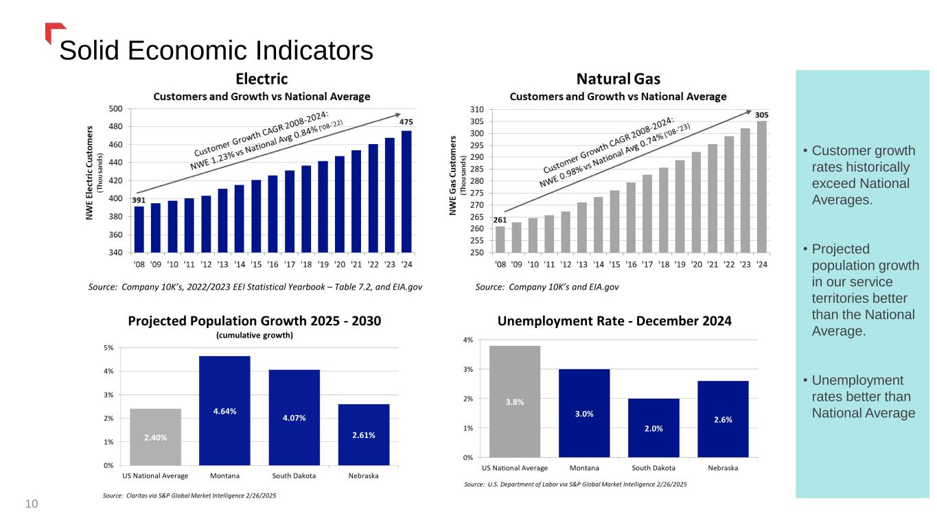 Strong Utility Foundation 9 • Solid JD Power Overall Customer Satisfaction Scores • Solid electric system reliability • Residential rates below national average1 • Better than average natural gas leaks per mile 1) NWE rates are average for 2024 - total residential revenues divided by total residential loads delivered Electric source: U.S. EIA - Average Retail Price of Electricity, Annual for 2024 Natural Gas source: U.S. EIA - U.S. Price of Natural Gas Delivered to Residential Customers for 2024