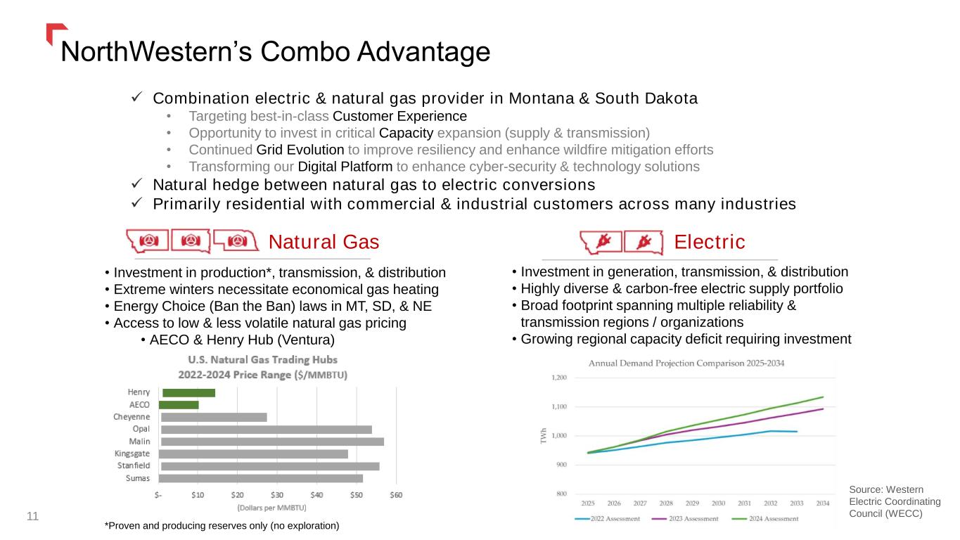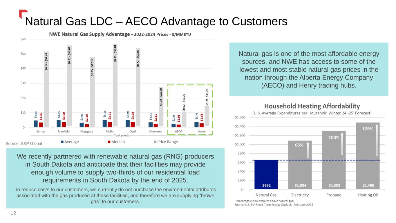 • Investment in production*, transmission, & distribution • Extreme winters necessitate economical gas heating • Energy Choice (Ban the Ban) laws in MT, SD, & NE • Access to low & less volatile natural gas pricing • AECO & Henry Hub (Ventura) *Proven and producing reserves only (no exploration) NorthWestern’s Combo Advantage 11 ✓ Combination electric & natural gas provider in Montana & South Dakota • Targeting best-in-class Customer Experience • Opportunity to invest in critical Capacity expansion (supply & transmission) • Continued Grid Evolution to improve resiliency and enhance wildfire mitigation efforts • Transforming our Digital Platform to enhance cyber-security & technology solutions ✓ Natural hedge between natural gas to electric conversions ✓ Primarily residential with commercial & industrial customers across many industries • Investment in generation, transmission, & distribution • Highly diverse & carbon-free electric supply portfolio • Broad footprint spanning multiple reliability & transmission regions / organizations • Growing regional capacity deficit requiring investment ElectricNatural Gas Source: Western Electric Coordinating Council (WECC)
