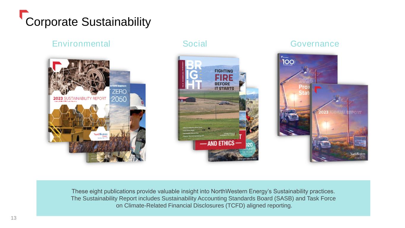 Natural Gas LDC – AECO Advantage to Customers 12 Natural gas is one of the most affordable energy sources, and NWE has access to some of the lowest and most stable natural gas prices in the nation through the Alberta Energy Company (AECO) and Henry trading hubs. Source: S&P Global We recently partnered with renewable natural gas (RNG) producers in South Dakota and anticipate that their facilities may provide enough volume to supply two-thirds of our residential load requirements in South Dakota by the end of 2025. To reduce costs to our customers, we currently do not purchase the environmental attributes associated with the gas produced at these facilities, and therefore we are supplying “brown gas” to our customers.