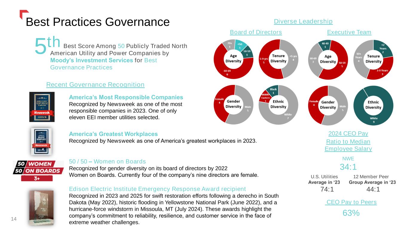 Best Practices Governance 14 America’s Most Responsible Companies Recognized by Newsweek as one of the most responsible companies in 2023. One of only eleven EEI member utilities selected. Board of Directors Executive Team 5th Best Score Among 50 Publicly Traded North American Utility and Power Companies by Moody’s Investment Services for Best Governance Practices Diverse Leadership 2024 CEO Pay Ratio to Median Employee Salary NWE 34:1 U.S. Utilities 12 Member Peer Average in ‘23 Group Average in ‘23 74:1 44:1 CEO Pay to Peers 63% Recent Governance Recognition America’s Greatest Workplaces Recognized by Newsweek as one of America’s greatest workplaces in 2023. 50 / 50 – Women on Boards Recognized for gender diversity on its board of directors by 2022 Women on Boards. Currently four of the company’s nine directors are female. Edison Electric Institute Emergency Response Award recipient Recognized in 2023 and 2025 for swift restoration efforts following a derecho in South Dakota (May 2022), historic flooding in Yellowstone National Park (June 2022), and a hurricane-force windstorm in Missoula, MT (July 2024). These awards highlight the company’s commitment to reliability, resilience, and customer service in the face of extreme weather challenges.