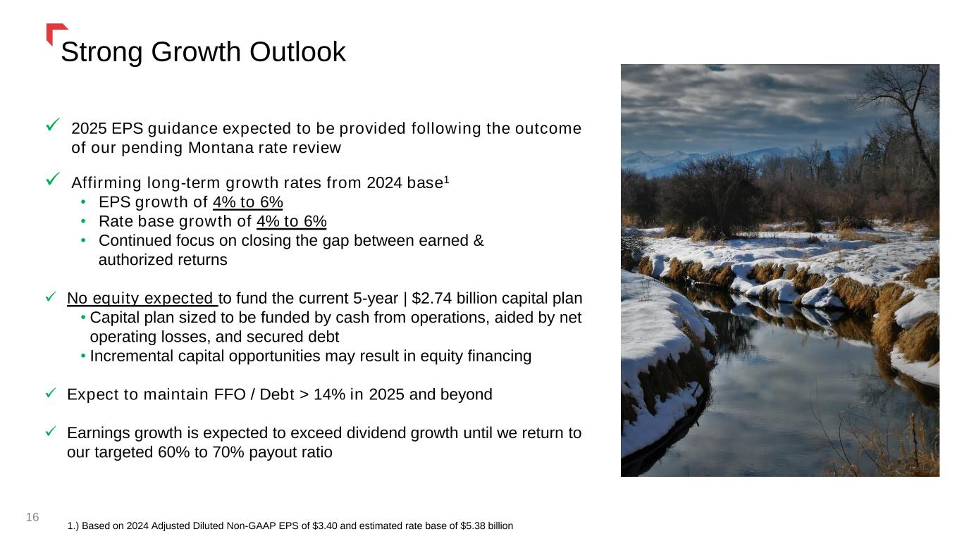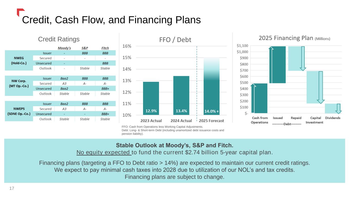 Strong Growth Outlook 16 ✓ 2025 EPS guidance expected to be provided following the outcome of our pending Montana rate review ✓ Affirming long-term growth rates from 2024 base1 • EPS growth of 4% to 6% • Rate base growth of 4% to 6% • Continued focus on closing the gap between earned & authorized returns ✓ No equity expected to fund the current 5-year | $2.74 billion capital plan • Capital plan sized to be funded by cash from operations, aided by net operating losses, and secured debt • Incremental capital opportunities may result in equity financing ✓ Expect to maintain FFO / Debt > 14% in 2025 and beyond ✓ Earnings growth is expected to exceed dividend growth until we return to our targeted 60% to 70% payout ratio 1.) Based on 2024 Adjusted Diluted Non-GAAP EPS of $3.40 and estimated rate base of $5.38 billion