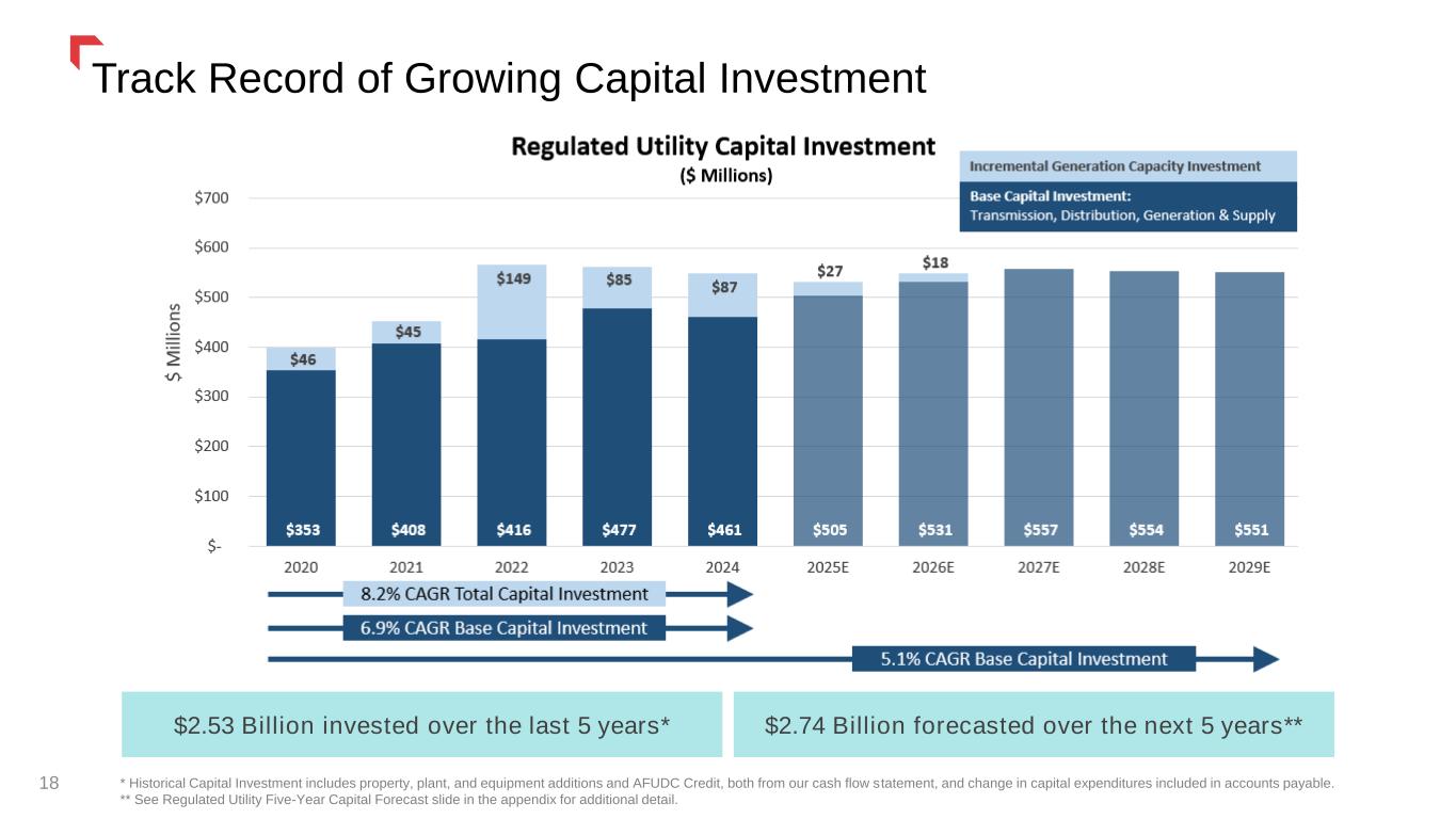 Credit, Cash Flow, and Financing Plans 17 Credit Ratings Stable Outlook at Moody’s, S&P and Fitch. No equity expected to fund the current $2.74 billion 5-year capital plan. Financing plans (targeting a FFO to Debt ratio > 14%) are expected to maintain our current credit ratings. We expect to pay minimal cash taxes into 2028 due to utilization of our NOL’s and tax credits. Financing plans are subject to change. FFO: Cash from Operations less Working Capital Adjustments. Debt: Long- & Short-term Debt (including unamortized debt issuance costs and pension liability).