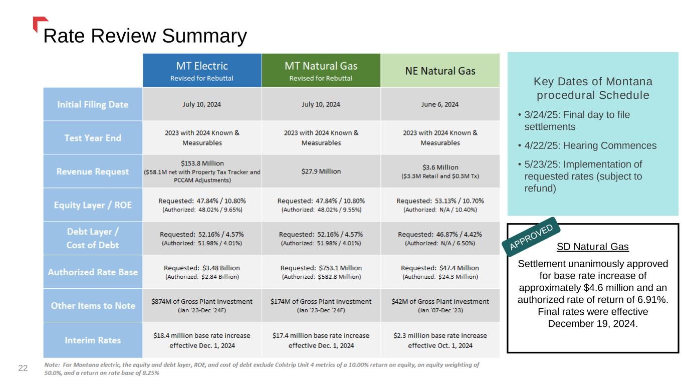 22 Rate Review Summary Key Dates of Montana procedural Schedule • 3/24/25: Final day to file settlements • 4/22/25: Hearing Commences • 5/23/25: Implementation of requested rates (subject to refund) SD Natural Gas Settlement unanimously approved for base rate increase of approximately $4.6 million and an authorized rate of return of 6.91%. Final rates were effective December 19, 2024.