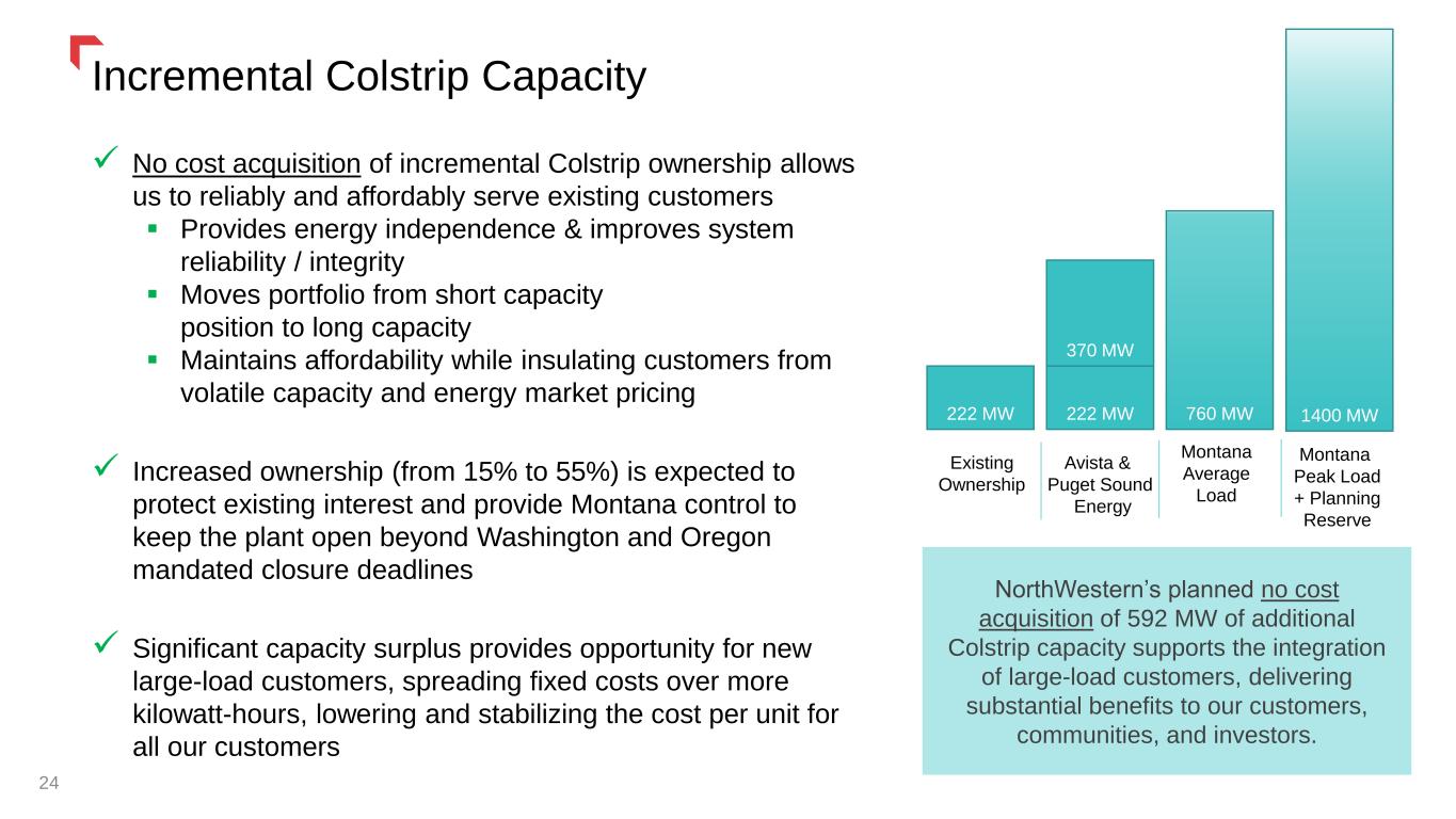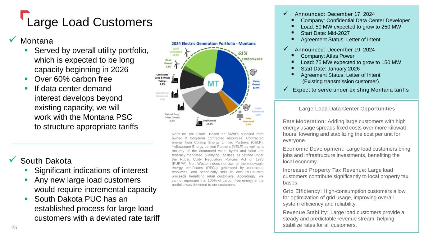 24 Incremental Colstrip Capacity NorthWestern’s planned no cost acquisition of 592 MW of additional Colstrip capacity supports the integration of large-load customers, delivering substantial benefits to our customers, communities, and investors. 760 MW Existing Ownership Montana Average Load ✓ No cost acquisition of incremental Colstrip ownership allows us to reliably and affordably serve existing customers ▪ Provides energy independence & improves system reliability / integrity ▪ Moves portfolio from short capacity position to long capacity ▪ Maintains affordability while insulating customers from volatile capacity and energy market pricing ✓ Increased ownership (from 15% to 55%) is expected to protect existing interest and provide Montana control to keep the plant open beyond Washington and Oregon mandated closure deadlines ✓ Significant capacity surplus provides opportunity for new large-load customers, spreading fixed costs over more kilowatt-hours, lowering and stabilizing the cost per unit for all our customers 222 MW 222 MW 370 MW Avista & Puget Sound Energy 1400 MW Montana Peak Load + Planning Reserve