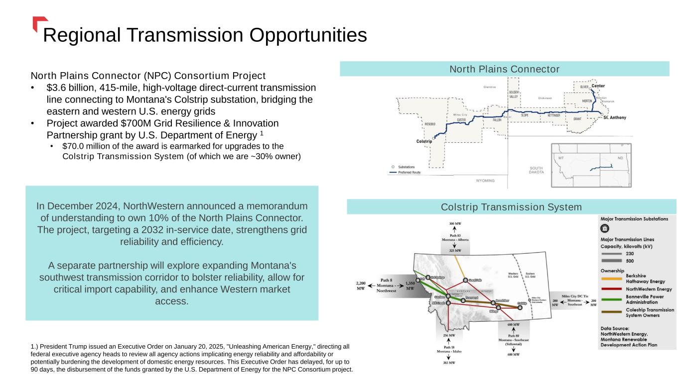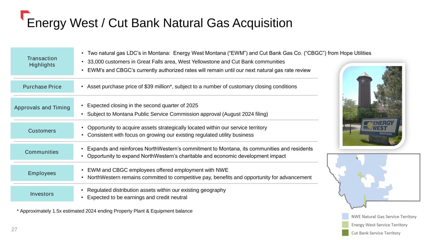 Regional Transmission Opportunities 26 Colstrip Transmission System North Plains Connector (NPC) Consortium Project • $3.6 billion, 415-mile, high-voltage direct-current transmission line connecting to Montana's Colstrip substation, bridging the eastern and western U.S. energy grids • Project awarded $700M Grid Resilience & Innovation Partnership grant by U.S. Department of Energy 1 • $70.0 million of the award is earmarked for upgrades to the Colstrip Transmission System (of which we are ~30% owner) North Plains Connector In December 2024, NorthWestern announced a memorandum of understanding to own 10% of the North Plains Connector. The project, targeting a 2032 in-service date, strengthens grid reliability and efficiency. A separate partnership will explore expanding Montana's southwest transmission corridor to bolster reliability, allow for critical import capability, and enhance Western market access. 1.) President Trump issued an Executive Order on January 20, 2025, "Unleashing American Energy," directing all federal executive agency heads to review all agency actions implicating energy reliability and affordability or potentially burdening the development of domestic energy resources. This Executive Order has delayed, for up to 90 days, the disbursement of the funds granted by the U.S. Department of Energy for the NPC Consortium project.