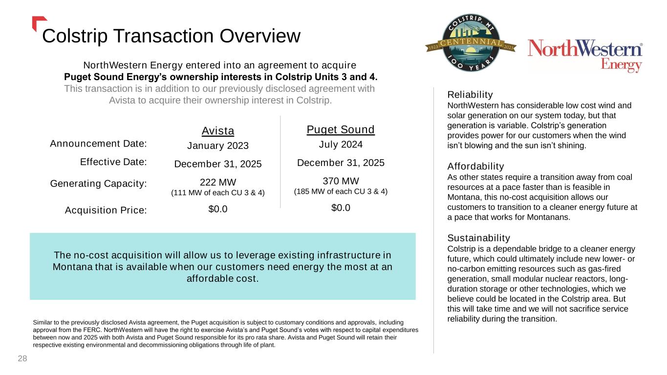 Energy West / Cut Bank Natural Gas Acquisition 27 Transaction Highlights Purchase Price Approvals and Timing • Two natural gas LDC’s in Montana: Energy West Montana (“EWM”) and Cut Bank Gas Co. (“CBGC”) from Hope Utilities • 33,000 customers in Great Falls area, West Yellowstone and Cut Bank communities • EWM’s and CBGC’s currently authorized rates will remain until our next natural gas rate review • Asset purchase price of $39 million*, subject to a number of customary closing conditions • Expected closing in the second quarter of 2025 • Subject to Montana Public Service Commission approval (August 2024 filing) • Opportunity to acquire assets strategically located within our service territory • Consistent with focus on growing our existing regulated utility business Customers • Expands and reinforces NorthWestern’s commitment to Montana, its communities and residents • Opportunity to expand NorthWestern’s charitable and economic development impact Communities • EWM and CBGC employees offered employment with NWE • NorthWestern remains committed to competitive pay, benefits and opportunity for advancement Employees • Regulated distribution assets within our existing geography • Expected to be earnings and credit neutral Investors * Approximately 1.5x estimated 2024 ending Property Plant & Equipment balance