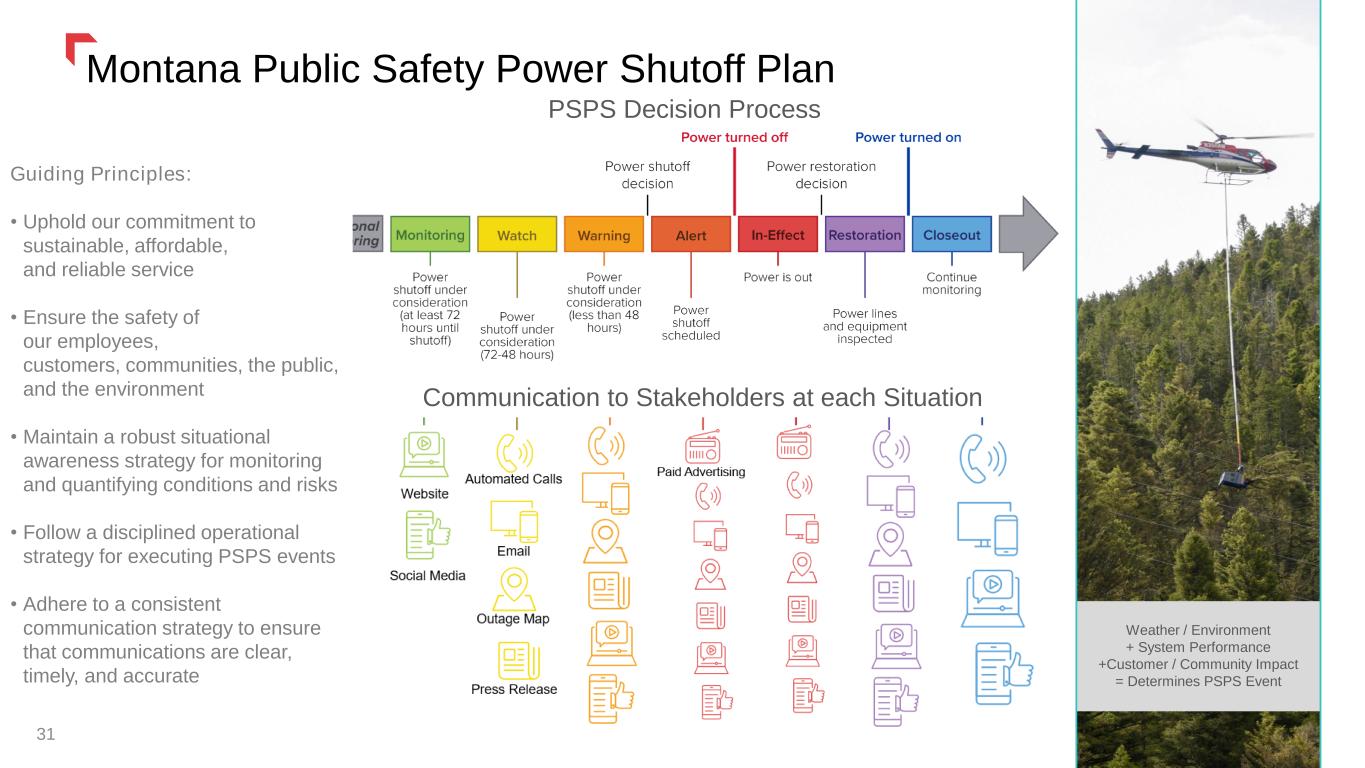 Montana Wildfire Mitigation Plan 30 Reduction of Ignition Potential System and Environmental Monitoring Enhanced Vegetation Maintenance Enriched Public Communication and Outreach ✓ Comprehensive summary of robust wildfire mitigation activities ✓ Expect to update plan with each electric rate review filing ✓ Deferral treatment for wildfire costs beyond amounts authorized in rates (up to $95 million over 5 years) ✓ Key elements of the plan, driven by risk analysis include: • Situational Awareness • Operational Practice • System Preparedness Operational Wildfire Defense Strategies Hierarchy Public Safety Power Shutoff (PSPS) considerations include environmental conditions, system performance, and mitigating any potential impacts of an outage to customers and emergency services. • Vegetation Management • Public Communication 5.9% of Distribution System line miles 7.3% of Transmission System line miles ✓ Minimal exposure to Tier 1* wildfire risk NorthWesternEnergy.com/Wildfire NorthWesternEnergy.com/Wildfire * Tier 1 includes both High System & High Environmental risk. See slide “Wildfire Risk Assessment” in the appendix for additional details.
