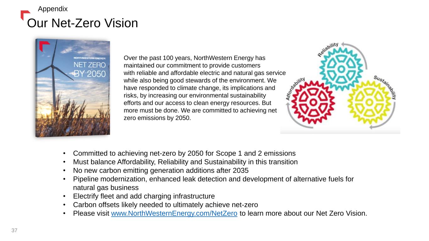 Our Net-Zero Vision Over the past 100 years, NorthWestern Energy has maintained our commitment to provide customers with reliable and affordable electric and natural gas service while also being good stewards of the environment. We have responded to climate change, its implications and risks, by increasing our environmental sustainability efforts and our access to clean energy resources. But more must be done. We are committed to achieving net zero emissions by 2050. • Committed to achieving net-zero by 2050 for Scope 1 and 2 emissions • Must balance Affordability, Reliability and Sustainability in this transition • No new carbon emitting generation additions after 2035 • Pipeline modernization, enhanced leak detection and development of alternative fuels for natural gas business • Electrify fleet and add charging infrastructure • Carbon offsets likely needed to ultimately achieve net-zero • Please visit www.NorthWesternEnergy.com/NetZero to learn more about our Net Zero Vision. 37 Appendix