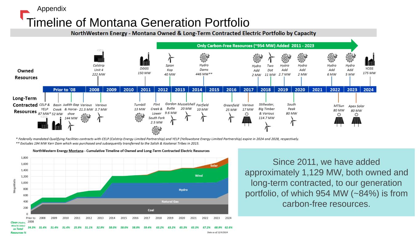 Timeline of Montana Generation Portfolio Since 2011, we have added approximately 1,129 MW, both owned and long-term contracted, to our generation portfolio, of which 954 MW (~84%) is from carbon-free resources. Appendix