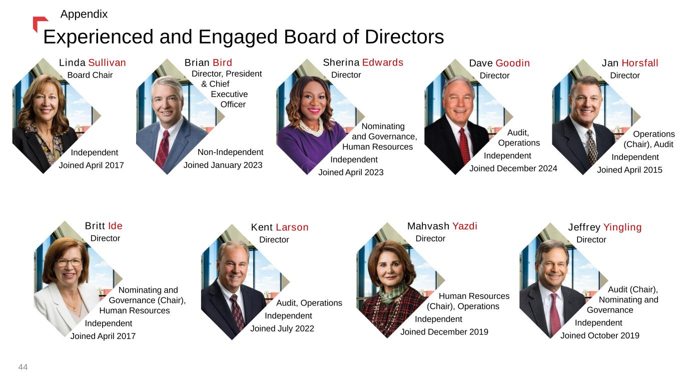 Experienced and Engaged Board of Directors 44 Linda Sullivan Board Chair Dave Goodin Director Sherina Edwards Director Brian Bird Director, President & Chief Executive Officer Britt Ide Director Kent Larson Director Mahvash Yazdi Director Jeffrey Yingling Director Human Resources (Chair), Operations Independent Joined December 2019 Independent Joined April 2017 Non-Independent Joined January 2023 Nominating and Governance, Human Resources Independent Joined April 2023 Audit, Operations Independent Joined December 2024 Audit, Operations Independent Joined July 2022 Jan Horsfall Director Operations (Chair), Audit Independent Joined April 2015 Audit (Chair), Nominating and Governance Independent Joined October 2019 Nominating and Governance (Chair), Human Resources Independent Joined April 2017 Appendix