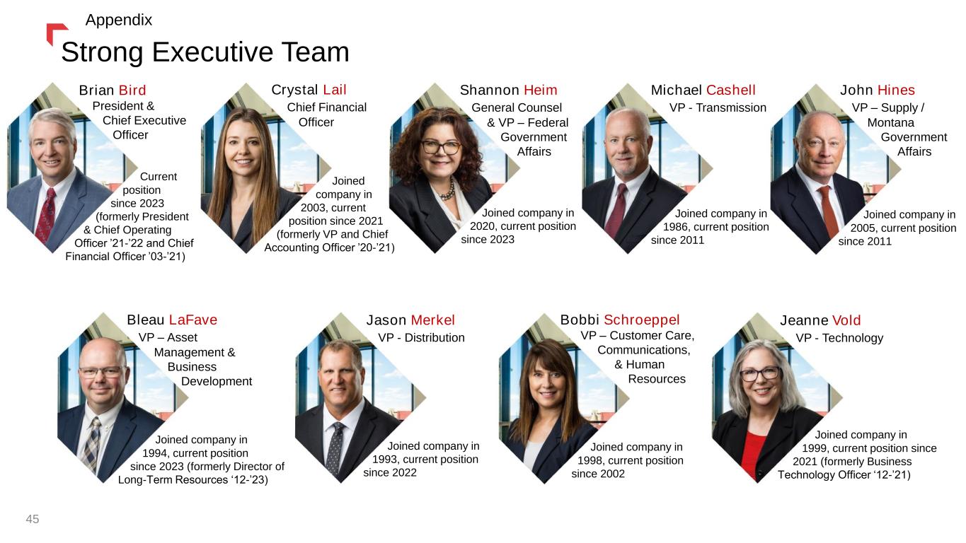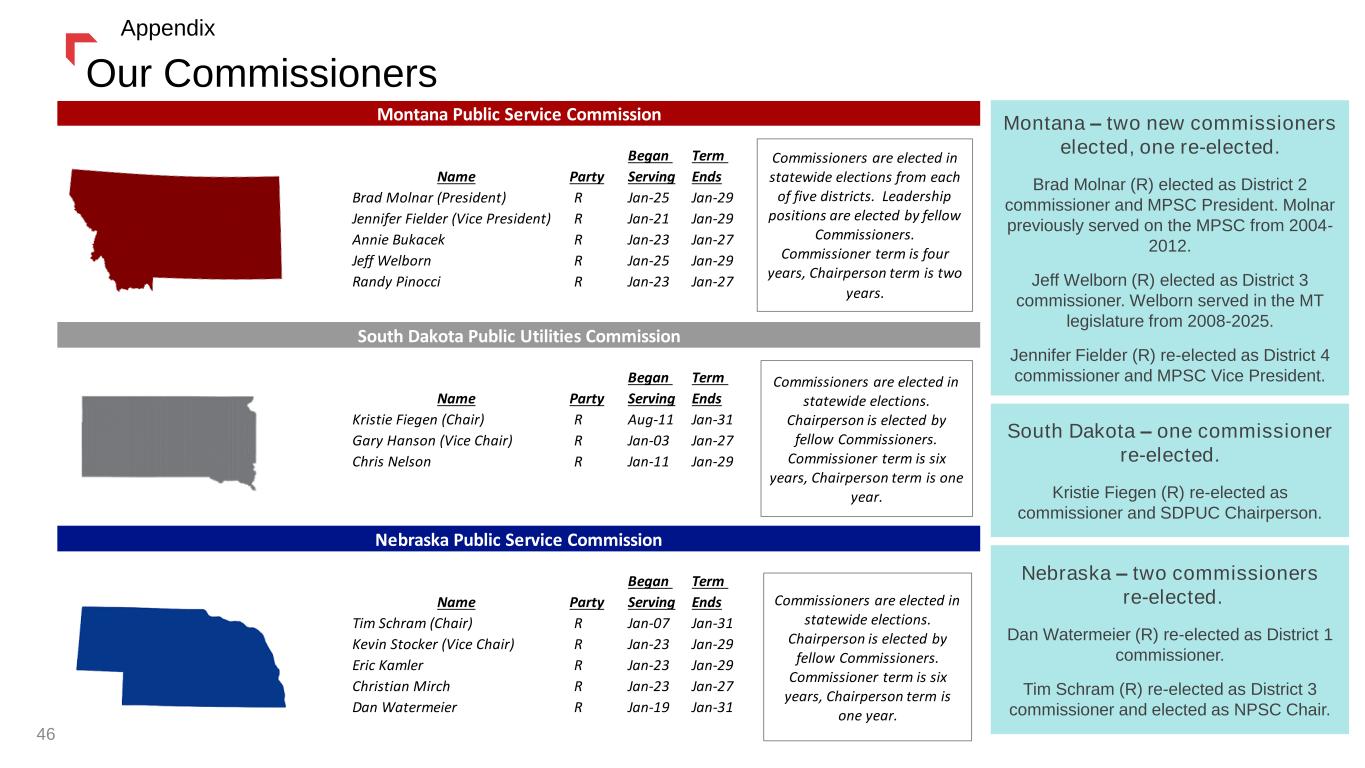 Strong Executive Team 45 Crystal Lail Chief Financial Officer Michael Cashell VP - Transmission Shannon Heim General Counsel & VP – Federal Government Affairs Brian Bird President & Chief Executive Officer Bleau LaFave VP – Asset Management & Business Development Jason Merkel VP - Distribution Bobbi Schroeppel VP – Customer Care, Communications, & Human Resources Jeanne Vold VP - Technology Joined company in 2020, current position since 2023 Joined company in 2003, current position since 2021 (formerly VP and Chief Accounting Officer ’20-’21) Joined company in 1986, current position since 2011 Current position since 2023 (formerly President & Chief Operating Officer ’21-’22 and Chief Financial Officer ’03-’21) Joined company in 1993, current position since 2022 John Hines VP – Supply / Montana Government Affairs Joined company in 2005, current position since 2011 Joined company in 1994, current position since 2023 (formerly Director of Long-Term Resources ‘12-’23) Joined company in 1998, current position since 2002 Joined company in 1999, current position since 2021 (formerly Business Technology Officer ‘12-’21) Appendix