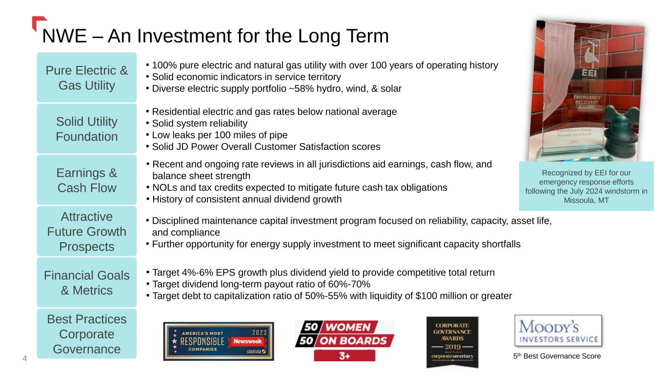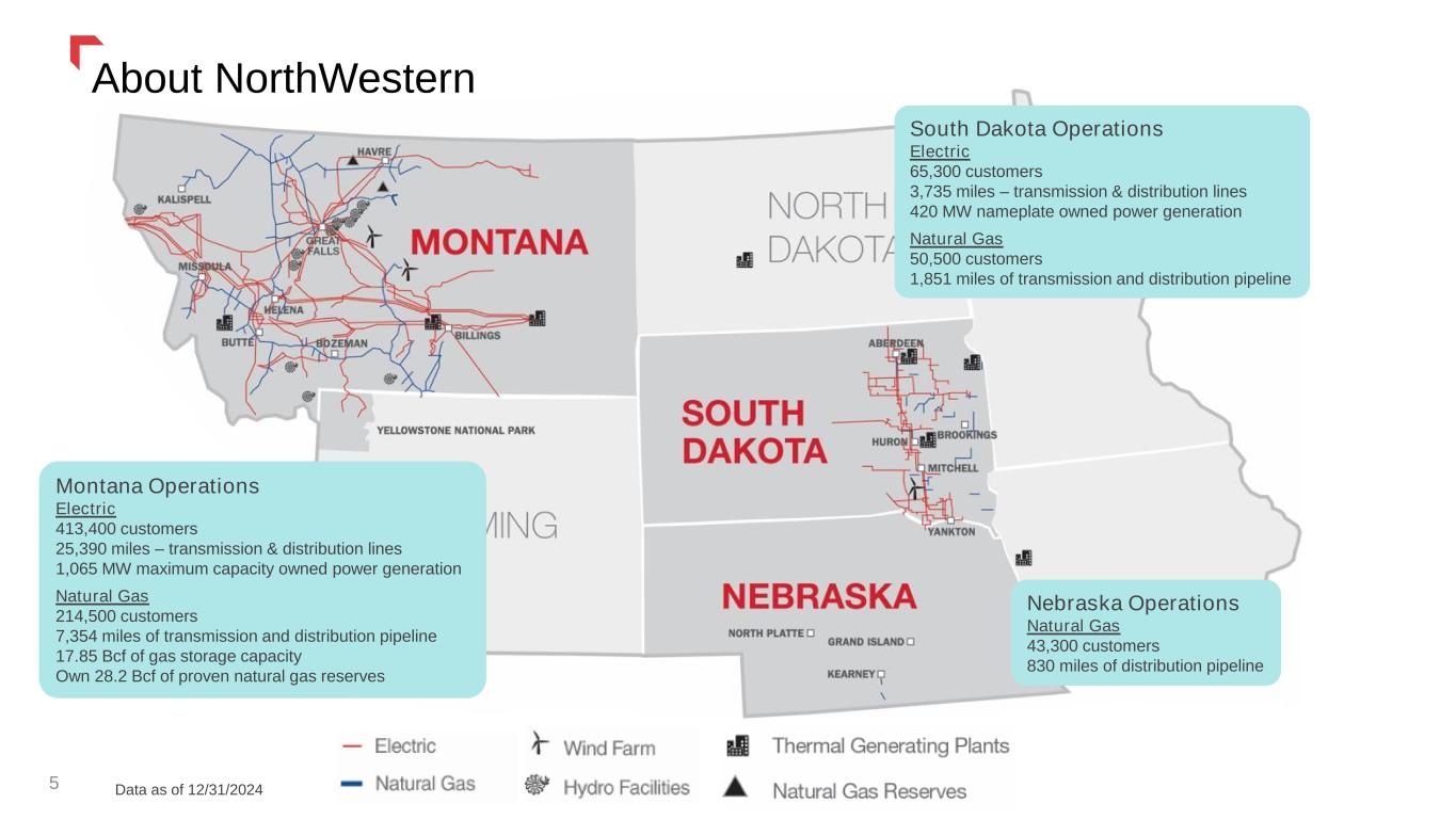 NWE – An Investment for the Long Term 4 • Recent and ongoing rate reviews in all jurisdictions aid earnings, cash flow, and balance sheet strength • NOLs and tax credits expected to mitigate future cash tax obligations • History of consistent annual dividend growth • 100% pure electric and natural gas utility with over 100 years of operating history • Solid economic indicators in service territory • Diverse electric supply portfolio ~58% hydro, wind, & solar Pure Electric & Gas Utility Solid Utility Foundation Earnings & Cash Flow Attractive Future Growth Prospects Financial Goals & Metrics Best Practices Corporate Governance • Residential electric and gas rates below national average • Solid system reliability • Low leaks per 100 miles of pipe • Solid JD Power Overall Customer Satisfaction scores • Disciplined maintenance capital investment program focused on reliability, capacity, asset life, and compliance • Further opportunity for energy supply investment to meet significant capacity shortfalls • Target 4%-6% EPS growth plus dividend yield to provide competitive total return • Target dividend long-term payout ratio of 60%-70% • Target debt to capitalization ratio of 50%-55% with liquidity of $100 million or greater 5th Best Governance Score Recognized by EEI for our emergency response efforts following the July 2024 windstorm in Missoula, MT