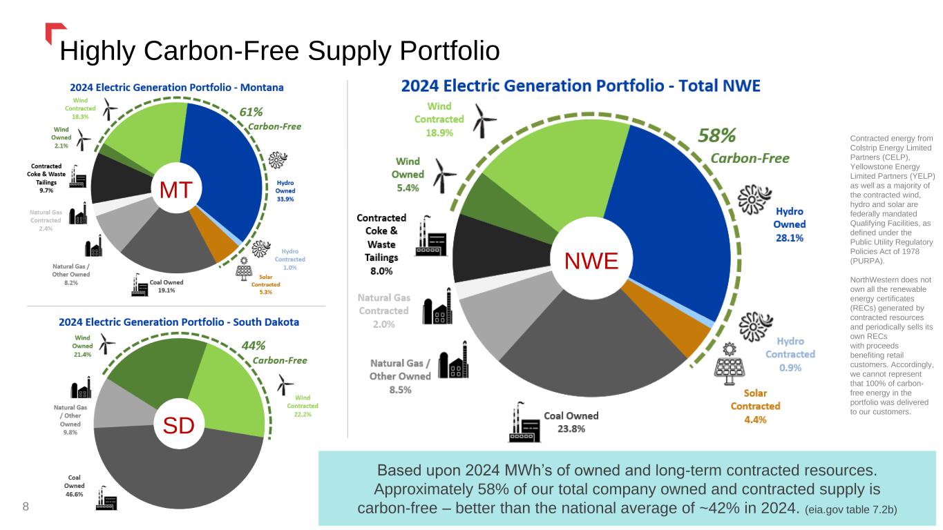 A Diversified Electric and Gas Utility 7 NorthWestern’s ‘80/20’ rules: Approximately 80% Electric and 80% Montana. Nearly $5.4 billion of rate base investment to serve our customers. Data as reported in our 2024 10-K