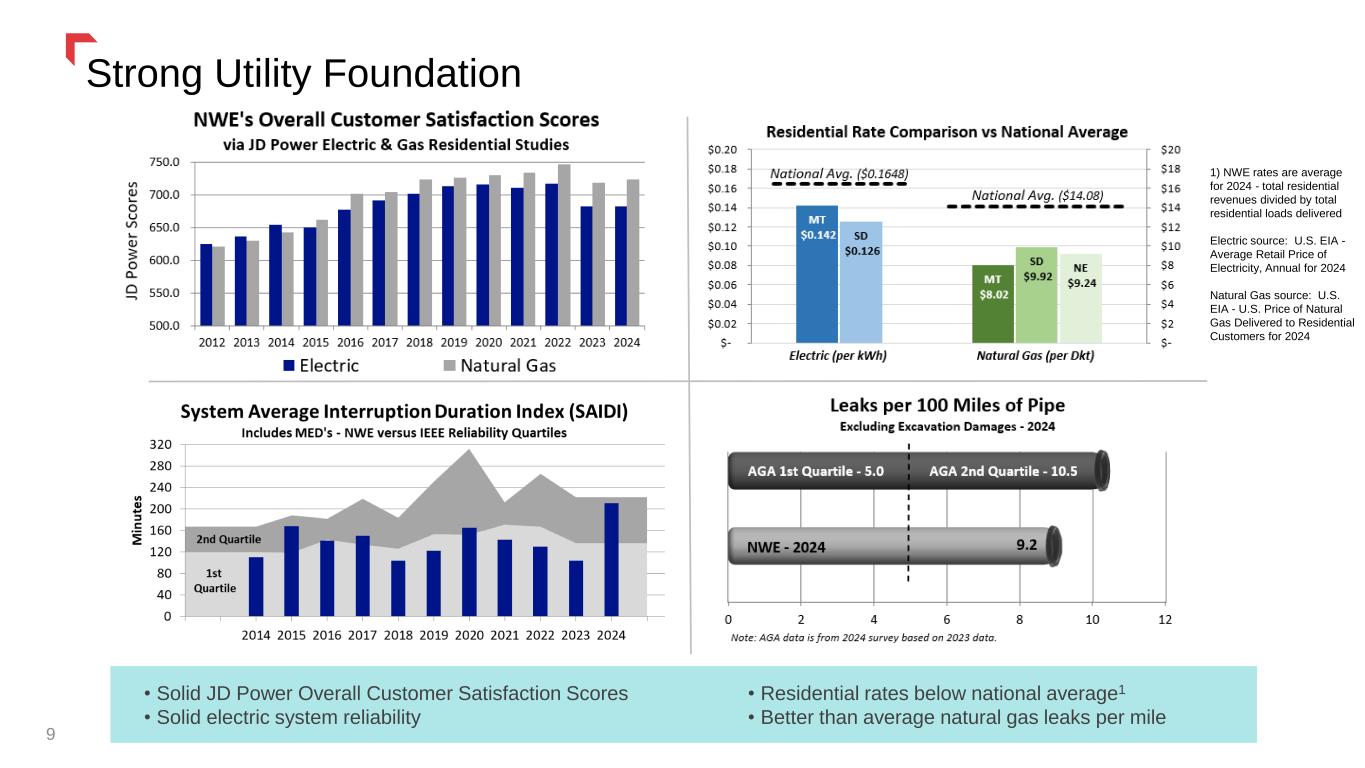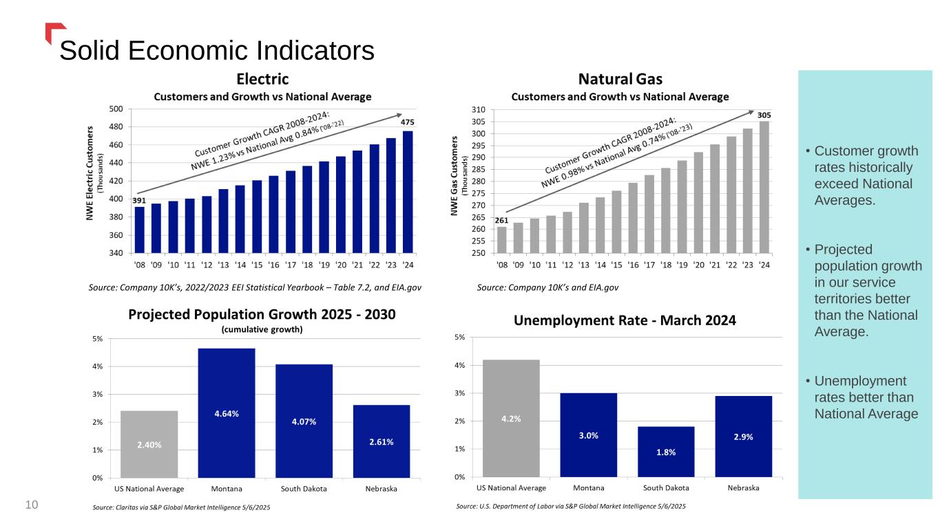 Strong Utility Foundation 9 • Solid JD Power Overall Customer Satisfaction Scores • Solid electric system reliability • Residential rates below national average1 • Better than average natural gas leaks per mile 1) NWE rates are average for 2024 - total residential revenues divided by total residential loads delivered Electric source: U.S. EIA - Average Retail Price of Electricity, Annual for 2024 Natural Gas source: U.S. EIA - U.S. Price of Natural Gas Delivered to Residential Customers for 2024