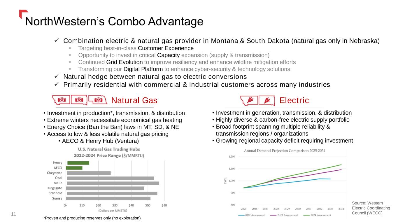 • Investment in production*, transmission, & distribution • Extreme winters necessitate economical gas heating • Energy Choice (Ban the Ban) laws in MT, SD, & NE • Access to low & less volatile natural gas pricing • AECO & Henry Hub (Ventura) *Proven and producing reserves only (no exploration) NorthWestern’s Combo Advantage 11 ✓ Combination electric & natural gas provider in Montana & South Dakota (natural gas only in Nebraska) • Targeting best-in-class Customer Experience • Opportunity to invest in critical Capacity expansion (supply & transmission) • Continued Grid Evolution to improve resiliency and enhance wildfire mitigation efforts • Transforming our Digital Platform to enhance cyber-security & technology solutions ✓ Natural hedge between natural gas to electric conversions ✓ Primarily residential with commercial & industrial customers across many industries • Investment in generation, transmission, & distribution • Highly diverse & carbon-free electric supply portfolio • Broad footprint spanning multiple reliability & transmission regions / organizations • Growing regional capacity deficit requiring investment ElectricNatural Gas Source: Western Electric Coordinating Council (WECC)