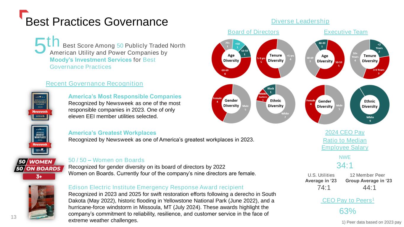 Best Practices Governance 13 America’s Most Responsible Companies Recognized by Newsweek as one of the most responsible companies in 2023. One of only eleven EEI member utilities selected. Board of Directors Executive Team 5th Best Score Among 50 Publicly Traded North American Utility and Power Companies by Moody’s Investment Services for Best Governance Practices Diverse Leadership 2024 CEO Pay Ratio to Median Employee Salary NWE 34:1 U.S. Utilities 12 Member Peer Average in ‘23 Group Average in ‘23 74:1 44:1 CEO Pay to Peers1 63% Recent Governance Recognition America’s Greatest Workplaces Recognized by Newsweek as one of America’s greatest workplaces in 2023. 50 / 50 – Women on Boards Recognized for gender diversity on its board of directors by 2022 Women on Boards. Currently four of the company’s nine directors are female. Edison Electric Institute Emergency Response Award recipient Recognized in 2023 and 2025 for swift restoration efforts following a derecho in South Dakota (May 2022), historic flooding in Yellowstone National Park (June 2022), and a hurricane-force windstorm in Missoula, MT (July 2024). These awards highlight the company’s commitment to reliability, resilience, and customer service in the face of extreme weather challenges. 1) Peer data based on 2023 pay