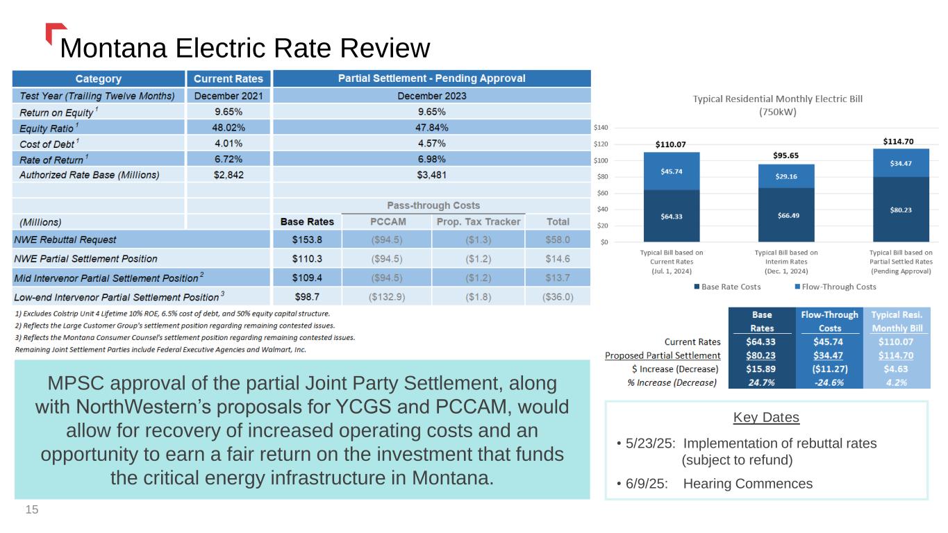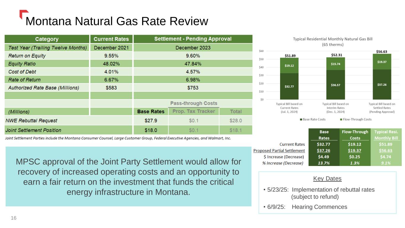 15 Montana Electric Rate Review MPSC approval of the partial Joint Party Settlement, along with NorthWestern’s proposals for YCGS and PCCAM, would allow for recovery of increased operating costs and an opportunity to earn a fair return on the investment that funds the critical energy infrastructure in Montana. Key Dates • 5/23/25: Implementation of rebuttal rates (subject to refund) • 6/9/25: Hearing Commences