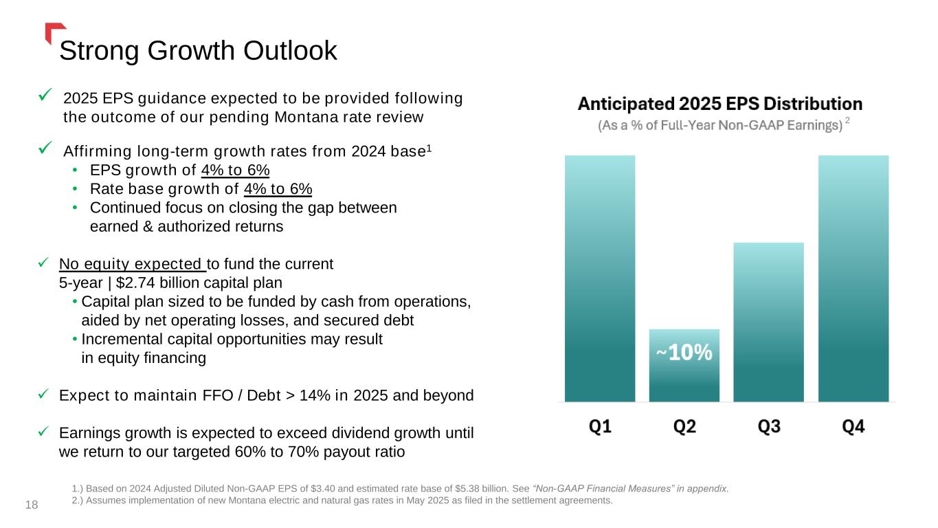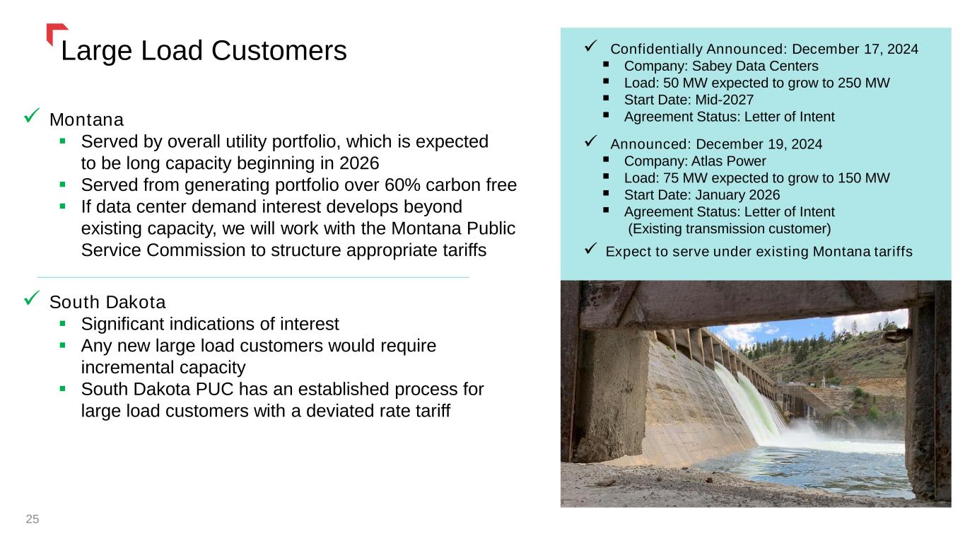 24 Transmission Bill Allows Certificate of Public Convenience & Necessity (CPCN) for electric transmission to be issued by the Montana Public Service Commission (MPSC) • Advanced Technology Includes solutions like advanced conductors to enhance capacity and reduce wildfire risk • Approvals MPSC shall determine within 300 days of application if transmission projects (greater than 69 kV) are in public interest and may grant or deny a CPCN • Cost Clarity post CPCN Within 90 days of application, the MPSC shall issue an order responding to a utilities request for advanced approval of prudent cost recovery. SB 301 was also passed by the Montana Legislature with broad bipartisan support and signed into law. This new law will provide greater confidence of fair and equitable returns to investors while incentivizing the continued modernization of the grid for our customers and communities.