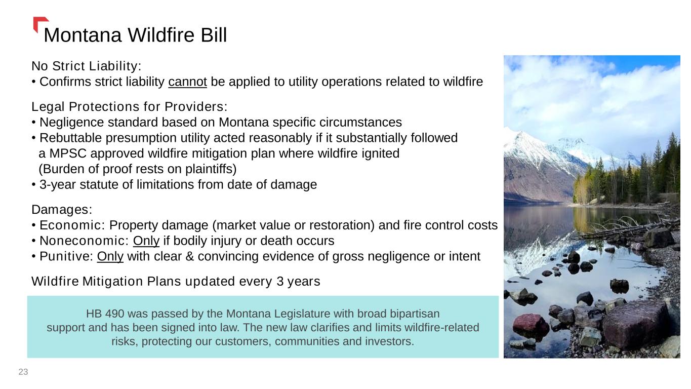 23 Montana Wildfire Bill No Strict Liability: • Confirms strict liability cannot be applied to utility operations related to wildfire Legal Protections for Providers: • Negligence standard based on Montana specific circumstances • Rebuttable presumption utility acted reasonably if it substantially followed a MPSC approved wildfire mitigation plan where wildfire ignited (Burden of proof rests on plaintiffs) • 3-year statute of limitations from date of damage Damages: • Economic: Property damage (market value or restoration) and fire control costs • Noneconomic: Only if bodily injury or death occurs • Punitive: Only with clear & convincing evidence of gross negligence or intent Wildfire Mitigation Plans updated every 3 years HB 490 was passed by the Montana Legislature with broad bipartisan support and has been signed into law. The new law clarifies and limits wildfire-related risks, protecting our customers, communities and investors.