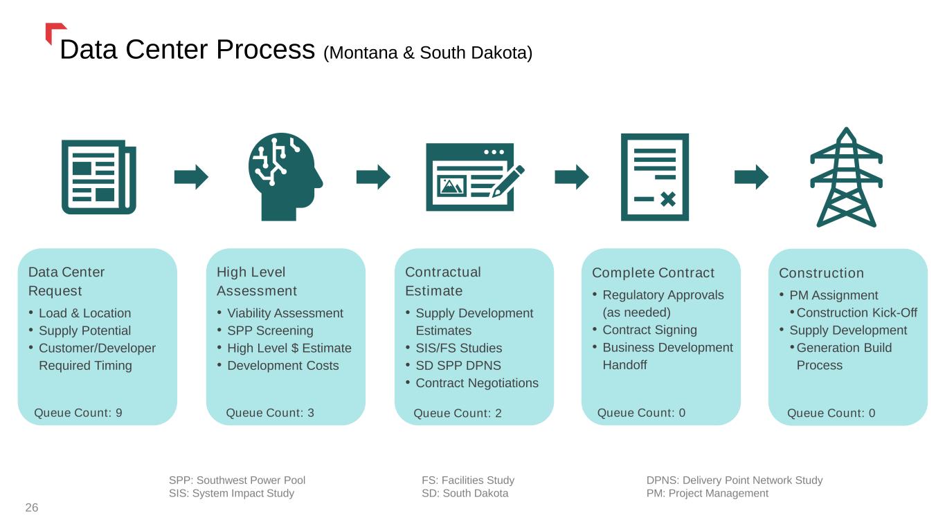 26 Data Center Process (Montana & South Dakota) Data Center Request • Load & Location • Supply Potential • Customer/Developer Required Timing High Level Assessment • Viability Assessment • SPP Screening • High Level $ Estimate • Development Costs Contractual Estimate • Supply Development Estimates • SIS/FS Studies • SD SPP DPNS • Contract Negotiations Complete Contract • Regulatory Approvals (as needed) • Contract Signing • Business Development Handoff Construction • PM Assignment • Construction Kick-Off • Supply Development • Generation Build Process SPP: Southwest Power Pool SIS: System Impact Study FS: Facilities Study SD: South Dakota DPNS: Delivery Point Network Study PM: Project Management Queue Count: 9 Queue Count: 3 Queue Count: 2 Queue Count: 0 Queue Count: 0