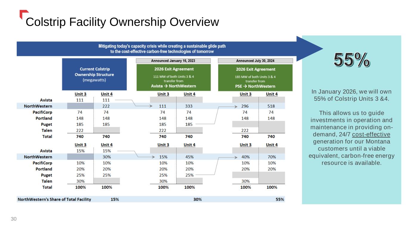 29 Incremental Colstrip Capacity NorthWestern’s planned no cost acquisition of 592 MW of additional Colstrip capacity supports the integration of large-load customers, delivering substantial benefits to our customers, communities, and investors. 760 MW Existing Ownership Montana Average Load ✓ No cost acquisition of incremental Colstrip ownership allows us to reliably and affordably serve existing customers ▪ Provides energy independence & improves system reliability / integrity ▪ Moves portfolio from short capacity position to long capacity ▪ Maintains affordability while insulating customers from volatile capacity and energy market pricing ✓ Increased ownership (from 15% to 55%) is expected to protect existing interest and provide Montana control to keep the plant open beyond Washington and Oregon mandated closure deadlines ✓ Significant capacity surplus provides opportunity for new large-load customers, spreading fixed costs over more kilowatt-hours, lowering and stabilizing the cost per unit for all our customers 222 MW 222 MW 370 MW Avista & Puget Sound Energy 1400 MW Montana Peak Load + Planning Reserve
