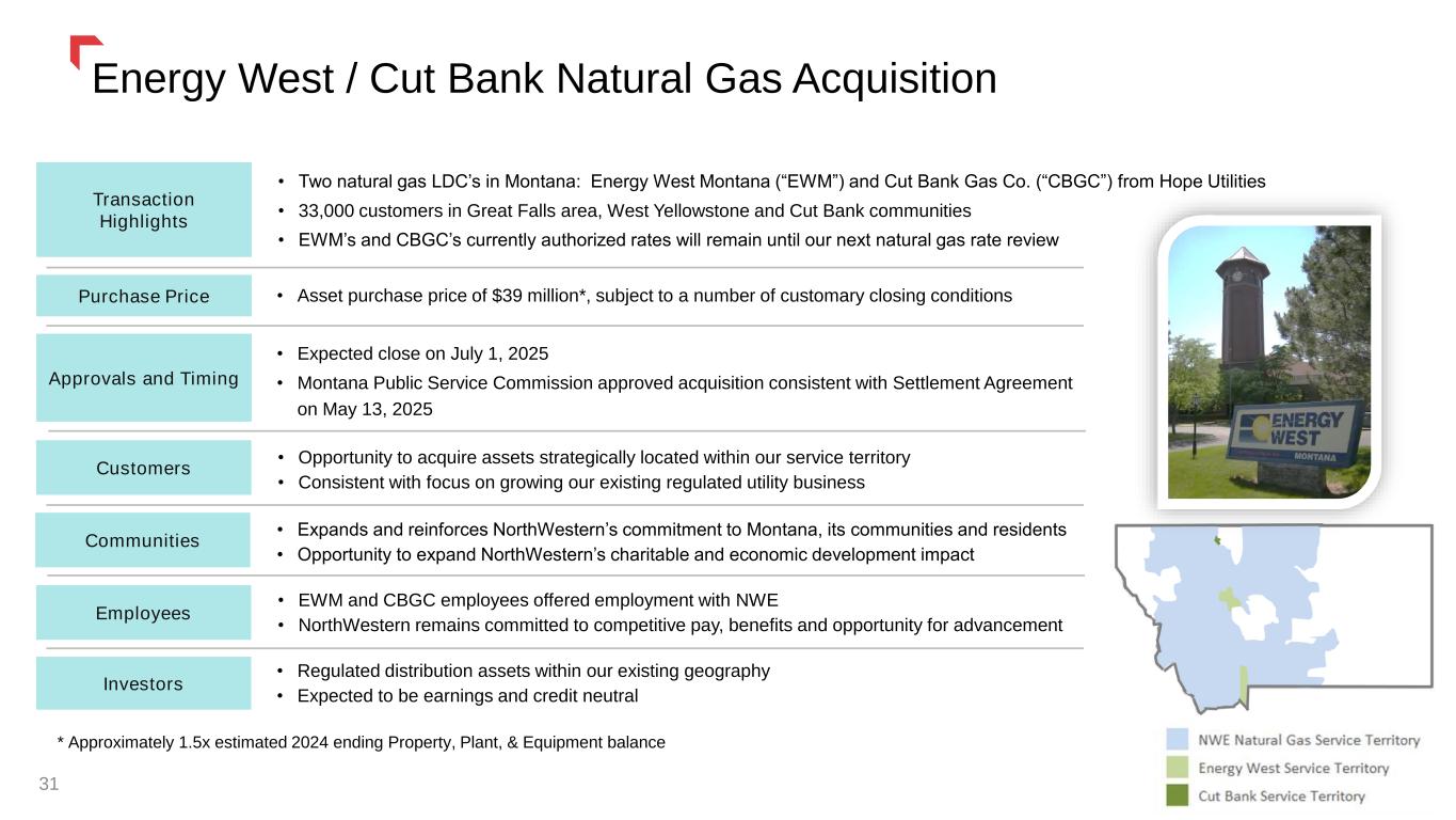 Energy West / Cut Bank Natural Gas Acquisition 31 Transaction Highlights Purchase Price Approvals and Timing • Two natural gas LDC’s in Montana: Energy West Montana (“EWM”) and Cut Bank Gas Co. (“CBGC”) from Hope Utilities • 33,000 customers in Great Falls area, West Yellowstone and Cut Bank communities • EWM’s and CBGC’s currently authorized rates will remain until our next natural gas rate review • Asset purchase price of $39 million*, subject to a number of customary closing conditions • Expected close on July 1, 2025 • Montana Public Service Commission approved acquisition consistent with Settlement Agreement on May 13, 2025 • Opportunity to acquire assets strategically located within our service territory • Consistent with focus on growing our existing regulated utility business Customers • Expands and reinforces NorthWestern’s commitment to Montana, its communities and residents • Opportunity to expand NorthWestern’s charitable and economic development impact Communities • EWM and CBGC employees offered employment with NWE • NorthWestern remains committed to competitive pay, benefits and opportunity for advancement Employees • Regulated distribution assets within our existing geography • Expected to be earnings and credit neutral Investors * Approximately 1.5x estimated 2024 ending Property, Plant, & Equipment balance