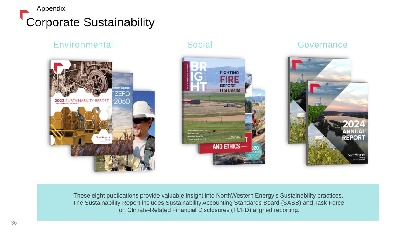 Corporate Sustainability 36 Environmental Social Governance These eight publications provide valuable insight into NorthWestern Energy’s Sustainability practices. The Sustainability Report includes Sustainability Accounting Standards Board (SASB) and Task Force on Climate-Related Financial Disclosures (TCFD) aligned reporting. Appendix