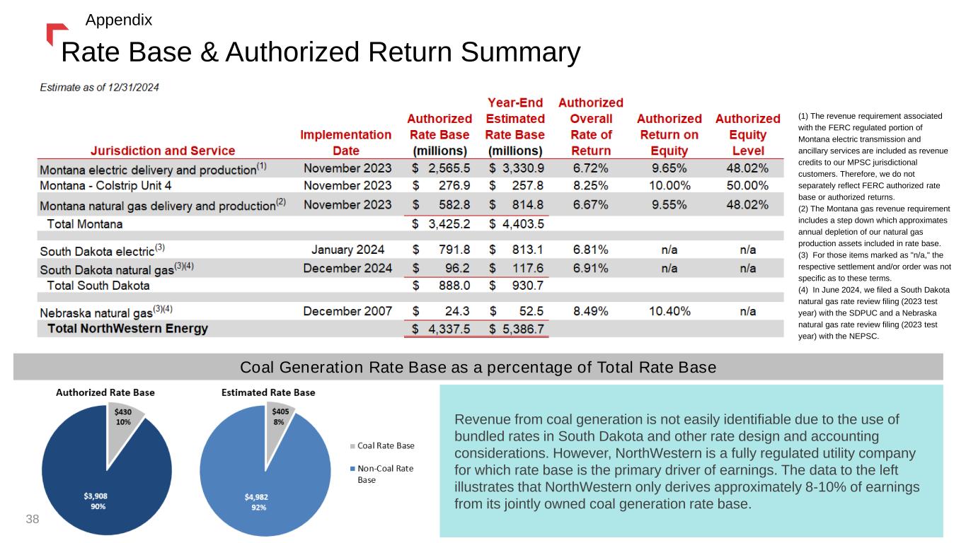 (1) The revenue requirement associated with the FERC regulated portion of Montana electric transmission and ancillary services are included as revenue credits to our MPSC jurisdictional customers. Therefore, we do not separately reflect FERC authorized rate base or authorized returns. (2) The Montana gas revenue requirement includes a step down which approximates annual depletion of our natural gas production assets included in rate base. (3) For those items marked as "n/a," the respective settlement and/or order was not specific as to these terms. (4) In June 2024, we filed a South Dakota natural gas rate review filing (2023 test year) with the SDPUC and a Nebraska natural gas rate review filing (2023 test year) with the NEPSC. Coal Generation Rate Base as a percentage of Total Rate Base Revenue from coal generation is not easily identifiable due to the use of bundled rates in South Dakota and other rate design and accounting considerations. However, NorthWestern is a fully regulated utility company for which rate base is the primary driver of earnings. The data to the left illustrates that NorthWestern only derives approximately 8-10% of earnings from its jointly owned coal generation rate base. Rate Base & Authorized Return Summary Appendix 38