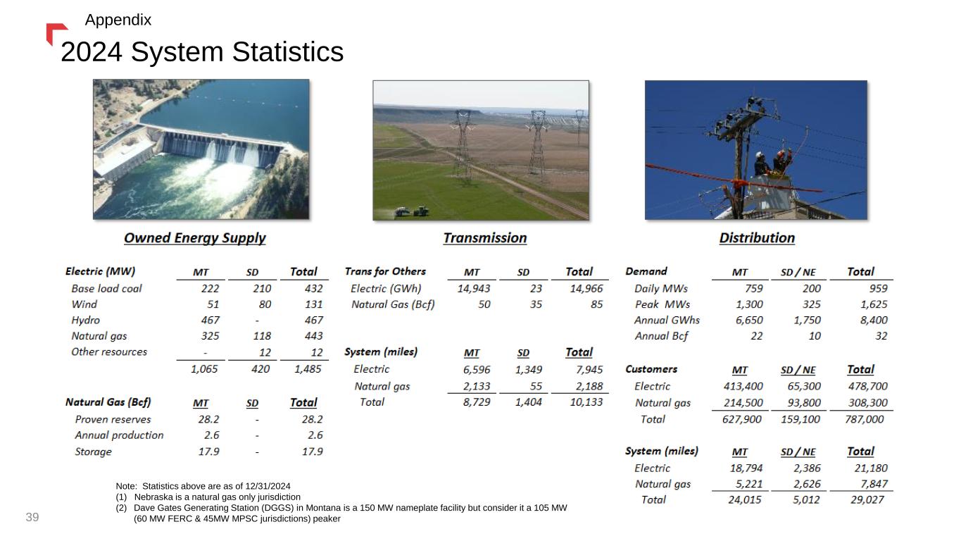 2024 System Statistics 39 Note: Statistics above are as of 12/31/2024 (1) Nebraska is a natural gas only jurisdiction (2) Dave Gates Generating Station (DGGS) in Montana is a 150 MW nameplate facility but consider it a 105 MW (60 MW FERC & 45MW MPSC jurisdictions) peaker Appendix
