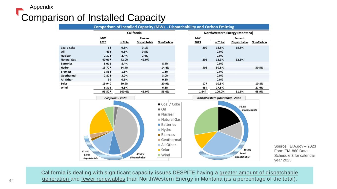 Comparison of Installed Capacity 42 California is dealing with significant capacity issues DESPITE having a greater amount of dispatchable generation and fewer renewables than NorthWestern Energy in Montana (as a percentage of the total). Source: EIA.gov – 2023 Form EIA-860 Data - Schedule 3 for calendar year 2023 Appendix MW 2023 of Total Dispatchable Non-Carbon 2023 of Total Dispatchable Non-Carbon Coal / Coke 63 0.1% 0.1% 309 18.8% 18.8% Oil 492 0.5% 0.5% 0.0% Nuclear 2,323 2.4% 2.4% 0.0% Natural Gas 40,097 42.0% 42.0% 202 12.3% 12.3% Batteries 8,011 8.4% 8.4% 0.0% Hydro 13,777 14.4% 14.4% 502 30.5% 30.5% Biomass 1,538 1.6% 1.6% 0.0% Geothermal 2,873 3.0% 3.0% 0.0% All Other 99 0.1% 0.1% 0.0% Solar 19,940 20.9% 20.9% 177 10.8% 10.8% Wind 6,315 6.6% 6.6% 454 27.6% 27.6% 95,527 100.0% 45.0% 55.0% 1,644 100.0% 31.1% 68.9% Comparison of Installed Capacity (MW) - Dispatchability and Carbon Emitting California NorthWestern Energy (Montana) Percent MW Percent