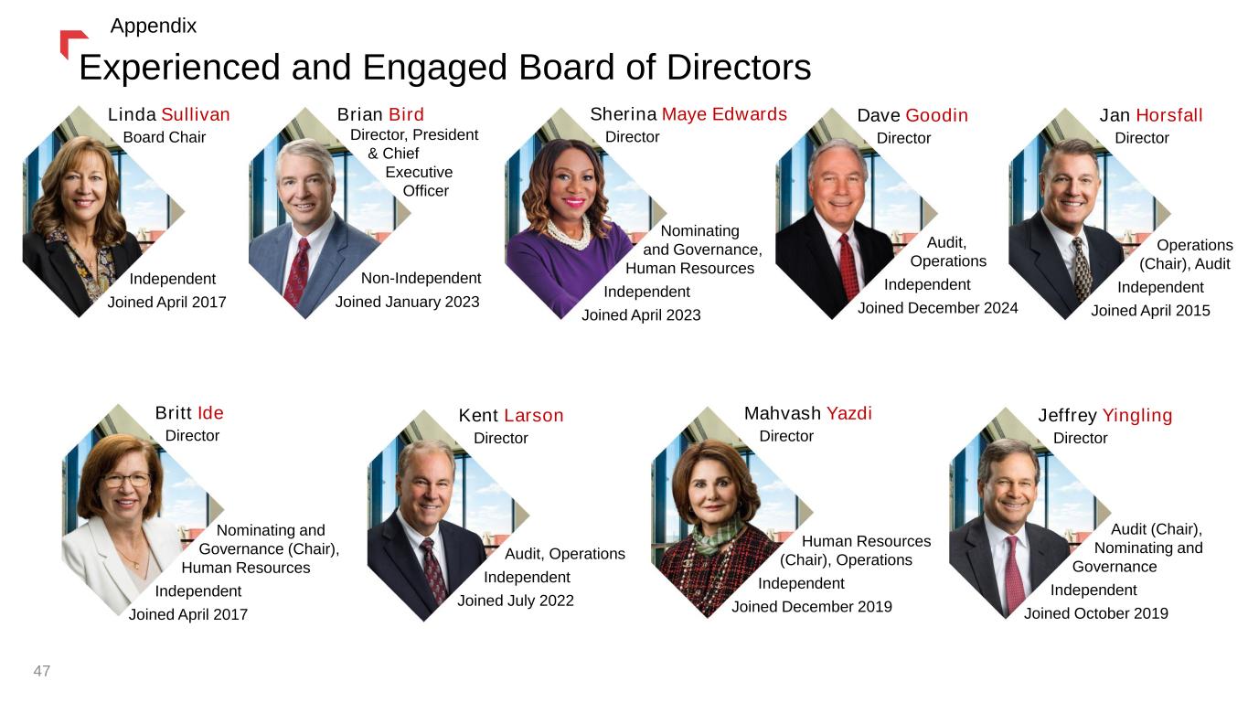 Experienced and Engaged Board of Directors 47 Linda Sullivan Board Chair Dave Goodin Director Sherina Maye Edwards Director Brian Bird Director, President & Chief Executive Officer Britt Ide Director Kent Larson Director Mahvash Yazdi Director Jeffrey Yingling Director Human Resources (Chair), Operations Independent Joined December 2019 Independent Joined April 2017 Non-Independent Joined January 2023 Nominating and Governance, Human Resources Independent Joined April 2023 Audit, Operations Independent Joined December 2024 Audit, Operations Independent Joined July 2022 Jan Horsfall Director Operations (Chair), Audit Independent Joined April 2015 Audit (Chair), Nominating and Governance Independent Joined October 2019 Nominating and Governance (Chair), Human Resources Independent Joined April 2017 Appendix